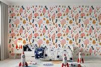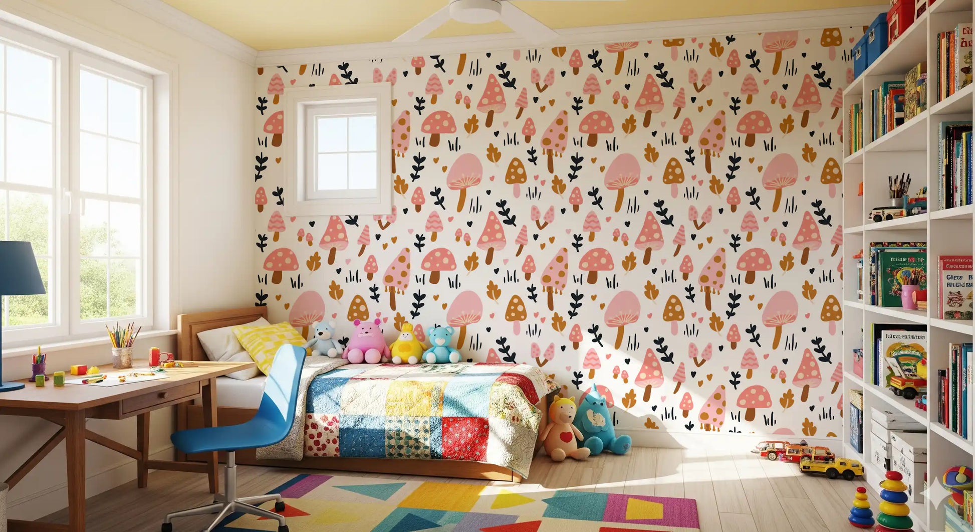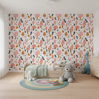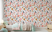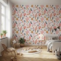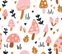This delightful wallpaper for walls brings a whimsical forest charm into any room. Featuring an enchanting pattern of hand-drawn mushrooms in various shapes and sizes, the design scatters soft pink and warm brown fungi across a crisp white background. Stylised dark leaves and tiny hearts complement the playful motif, adding a touch of nature-inspired sweetness. This wallpaper works beautifully in a child's bedroom or nursery, fostering an imaginative and serene atmosphere. It also creates a charming accent wall in a cosy living room or a cheerful playroom. The modern, bohemian aesthetic and muted colour palette enhance interior spaces by infusing them with a gentle, inviting warmth and unique character.