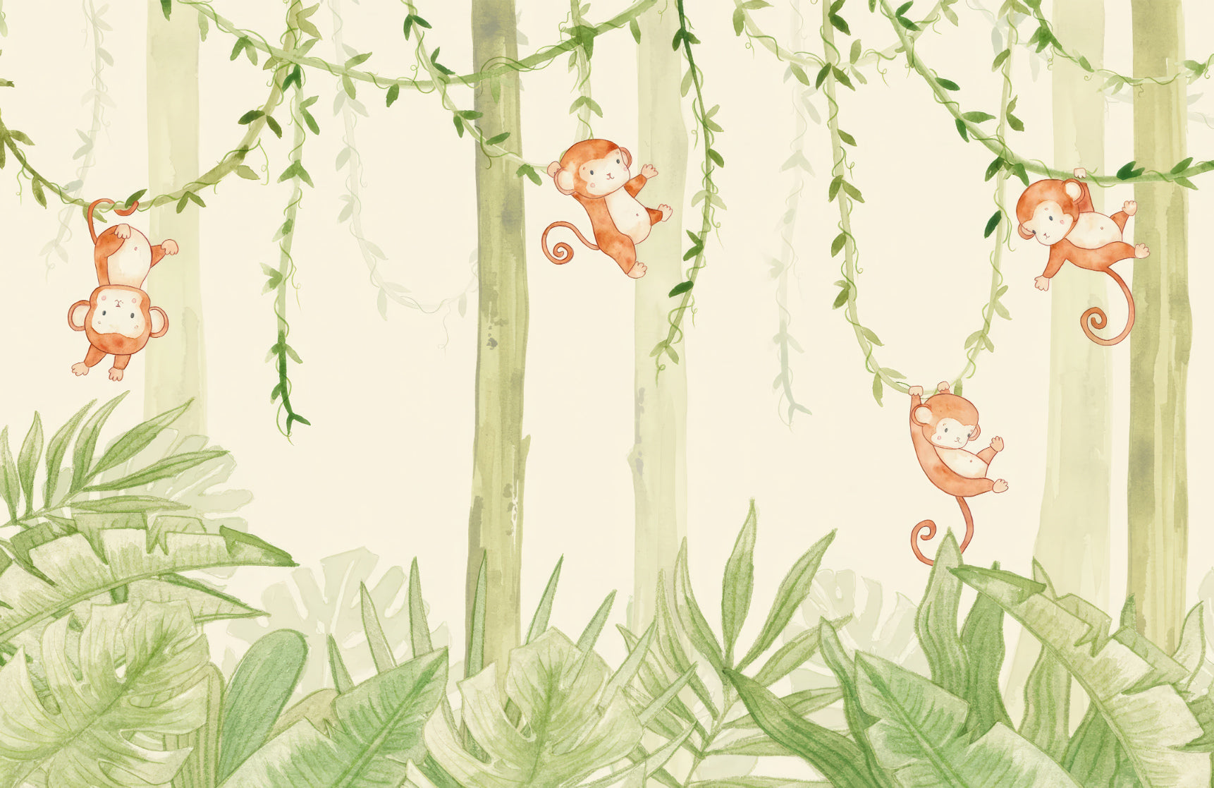 Transform your childs room into an adventure in the jungle with our swinging monkey wallpaper mural with playful monkeys in a lush jungle. This lively monkey wallpaper mural brings imagination and fun into any space. Ideal for the little ones' rooms, nurseries or playrooms, it brings excitement to the walls via easy-to-install and high-quality wallpaper, perfect for any safari- or jungle-themed room due to the material's durability, ensuring long-lasting beauty. Reliable to the parents, it's a masterpiece of creativity and style. Order now to create a one-of-a-kind, playful atmosphere for your child while making their room a true jungle adventure.