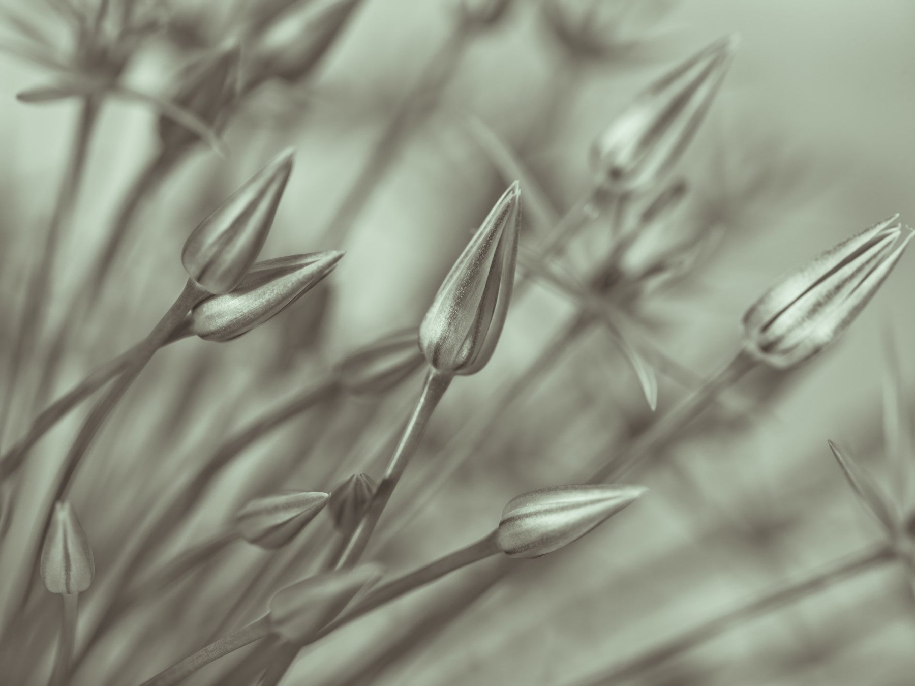 Allium flower, close-up. Immerse yourself in the serene beauty of 'Symphony of Alliums,' a captivating wallpaper that captures the delicate essence of allium flowers in their budding stage. This monochromatic masterpiece presents a harmonious arrangement of unopened blooms, their slender stems creating a visual rhythm across the canvas. The soft, muted tones evoke a sense of tranquility and understated elegance, perfect for adding a touch of natural sophistication to any digital space.