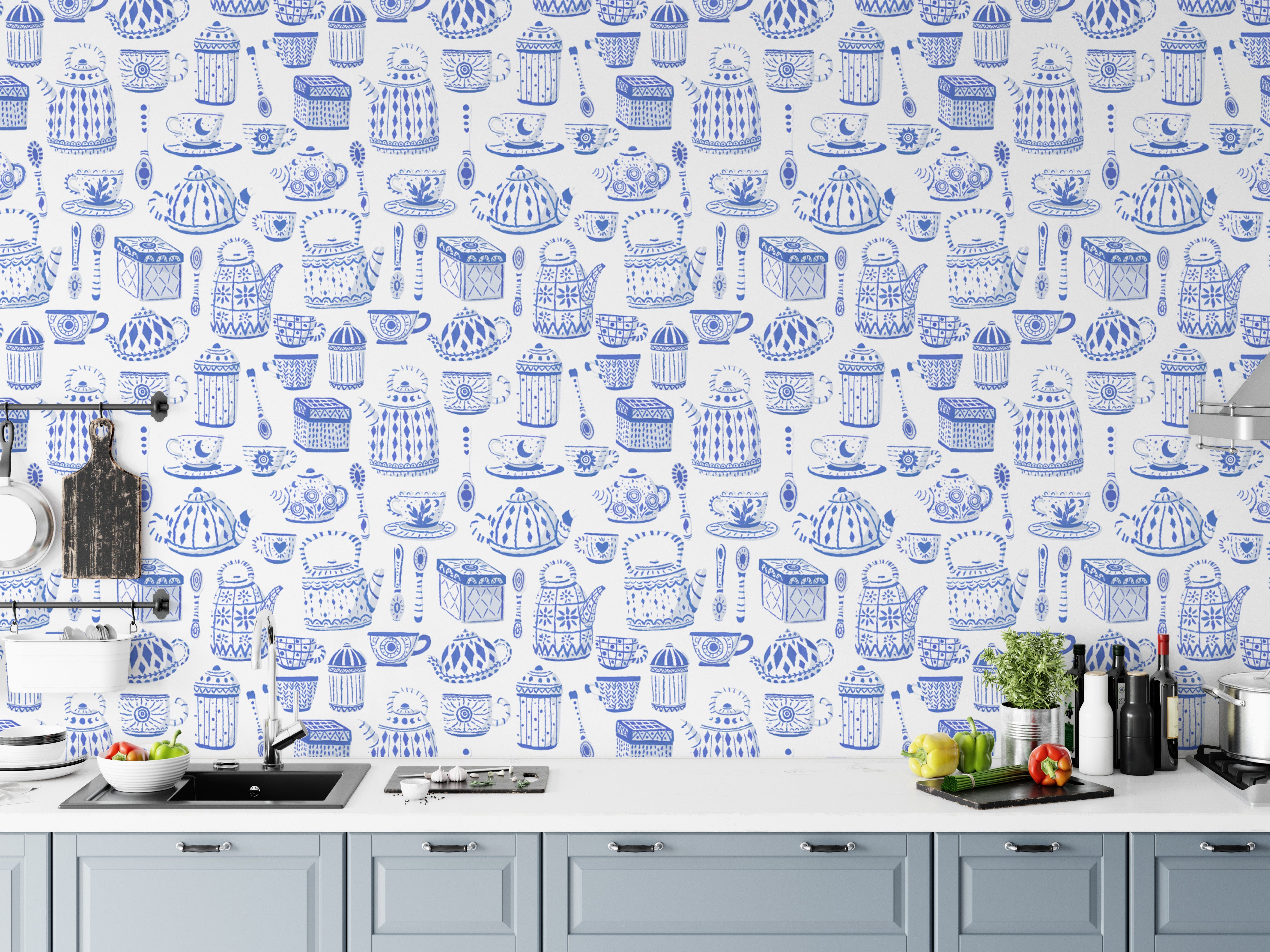 Tea Set yellow in Blue Color Wallpaper for kitchen walls Thispeel and stick wallpaper,boasting a blue tea set design, is the perfect way to spice up any kitchen. The sophisticated blue tones can complement both contemporary and traditional decor styles, so it is suited for people who adore different tastes of modern and also country style aesthetics. The result is this wallpaper, which is not only attractive but also functional, providing an easier means of freshening up your kitchen without a full renovation. Grab your wallpaper today and get free delivery. It will help you to make the kitchen a place where you could spend your time well.
