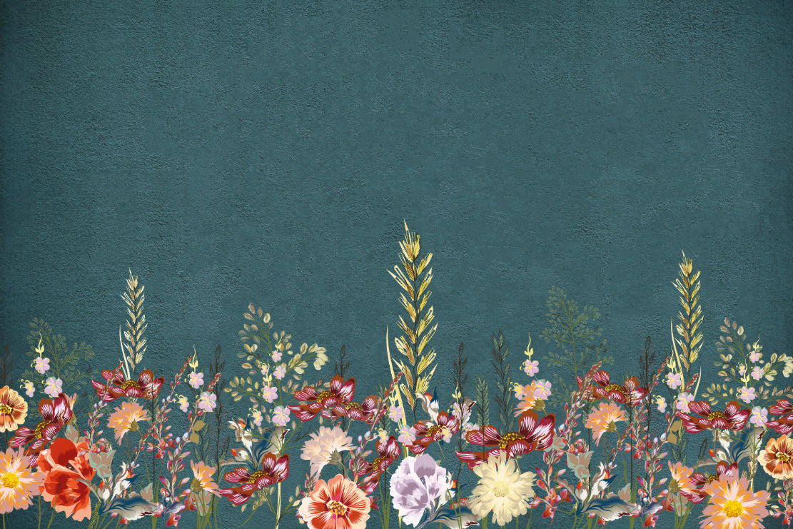 Brighten up your walls with the teal botanical wildflower wallpaper. Featuring a rich teal background, this botanical wildflower wall covering showcases vibrant blooms in shades of red, yellow, pink, and orange, paired with lush green foliage and golden wheat accents. The colorful flower wallpaper design blends modern style with natural beauty, making it perfect for living rooms, bedrooms, or creative spaces. The textured teal backdrop adds depth, while the vibrant wildflower pattern wallpaper brings warmth and charm. Ideal for nature lovers, this nature-inspired teal mural creates a lively, fresh look that complements both contemporary and classic interiors.