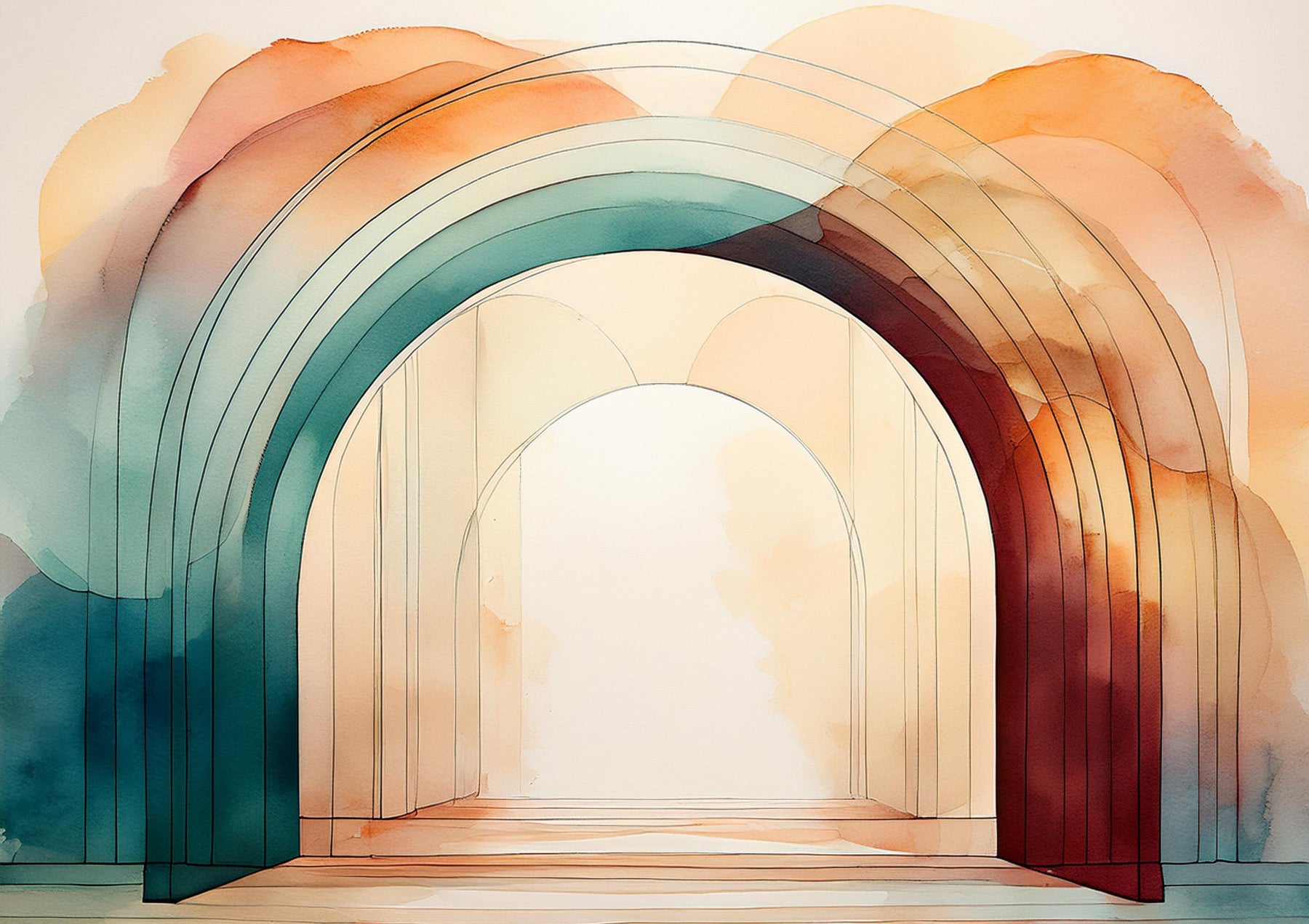 A stunning abstract wallpaper featuring a watercolor rendering of architectural arches. The design masterfully blends organic watercolor washes with precise architectural lines, creating a unique visual harmony. The color palette is rich yet muted, ranging from deep teal and burgundy to soft beige and orange. The overlapping arches create a sense of depth and perspective, drawing the viewer into the tranquil scene. This piece adds a touch of modern elegance and sophisticated calm to any space. The use of watercolor lends a hand-painted, artistic quality, making it a perfect choice for those seeking unique and stylish wall décor.