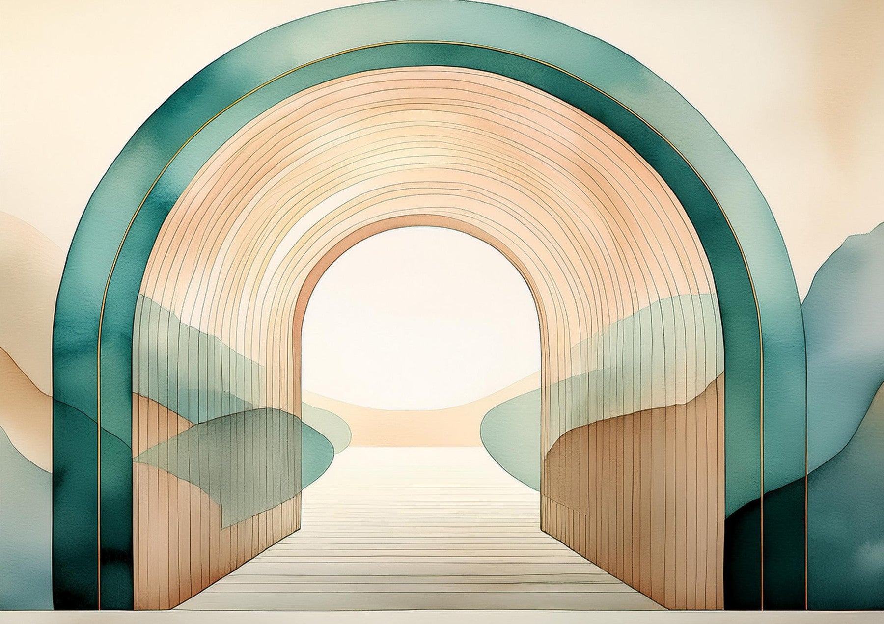 Escape to tranquility with this stunning wallpaper. A softly rendered watercolor archway in shades of teal and warm beige acts as a gateway to a peaceful landscape beyond. The delicate gold accents add a touch of luxury, while the linear design of the arch provides a modern, geometric element. The overall mood is one of calm and serenity, making it an ideal choice for bedrooms, living rooms, or meditation spaces. Let the peaceful atmosphere wash over you.