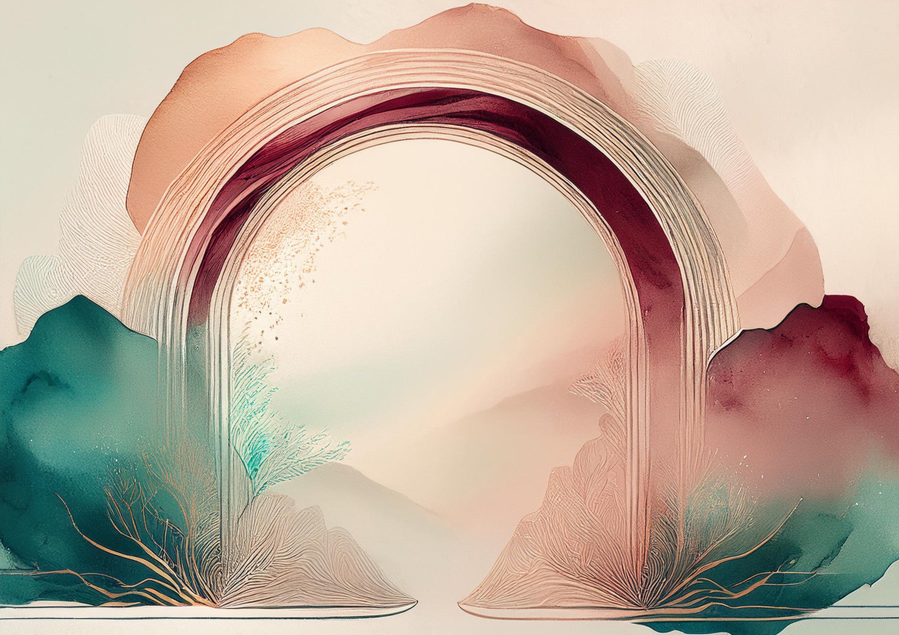 Journey through a mesmerizing 'Teal Dream Portal,' where a rich, burgundy and peach archway beckons. Intricate, golden-hued organic forms frame the gateway, evocative of ethereal underwater flora, merging seamlessly with soft, teal and rose-hued watercolor landscapes. The subtle texture and soft color palette create a serene and dreamlike atmosphere, perfect for a tranquil desktop escape. This abstract artwork invites contemplation and invites the viewer to step into a world of serene beauty and calming tranquility. The soft, muted colors and organic shapes create a feeling of peace and serenity, making it an ideal choice for those seeking a visually calming wallpaper.