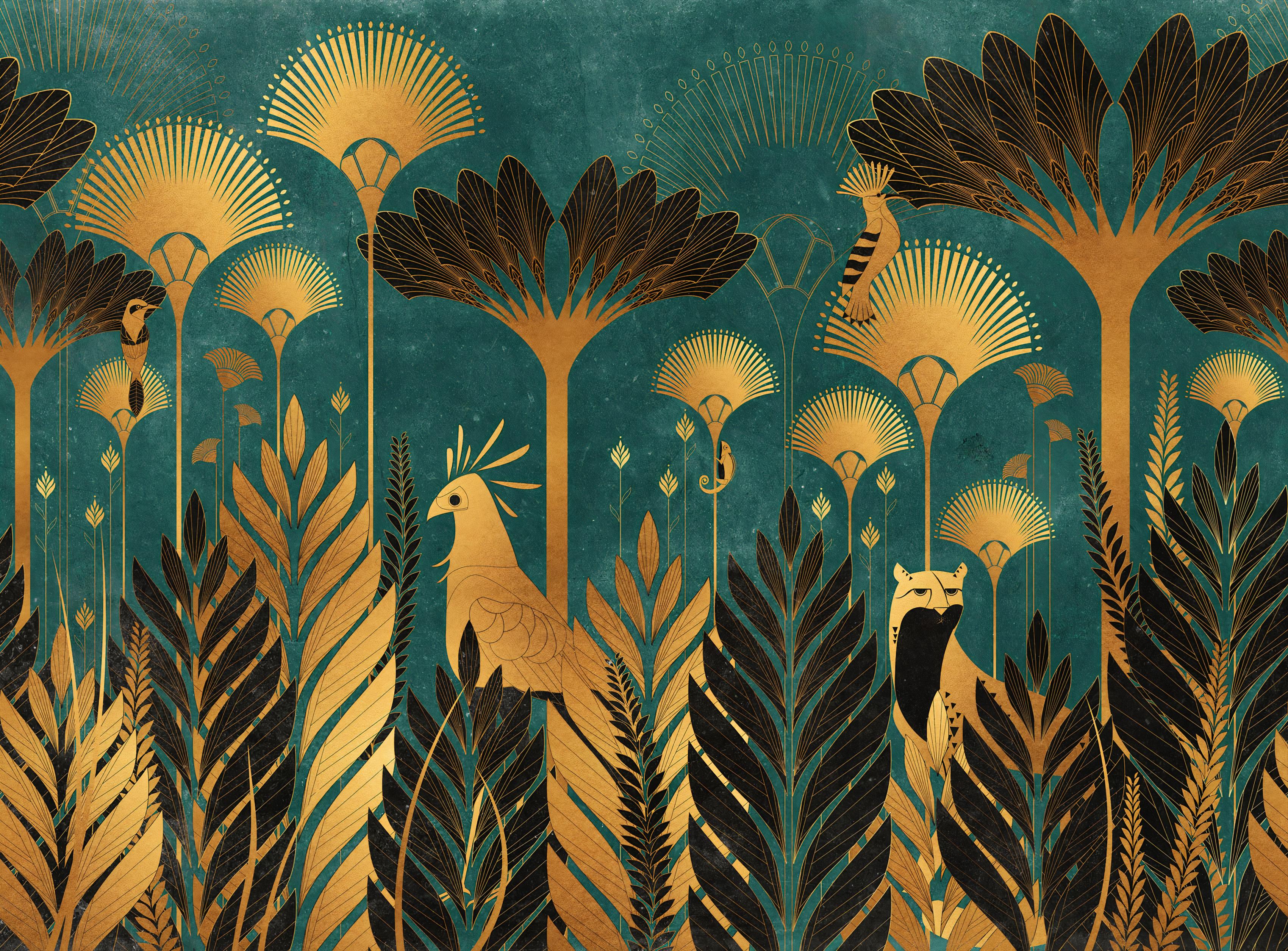 Teal luxurious Art Deco jungle wallpaper with golden parrots
