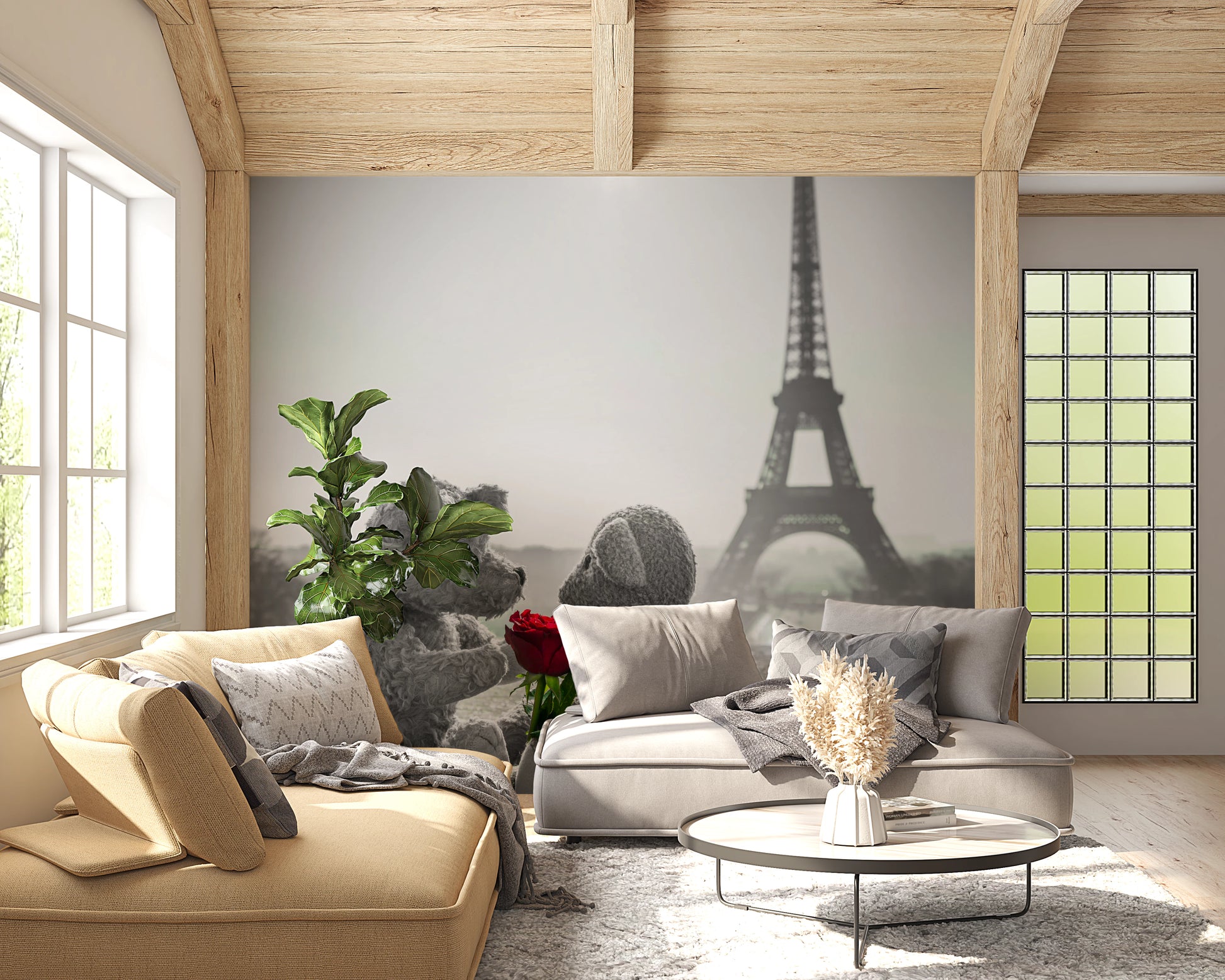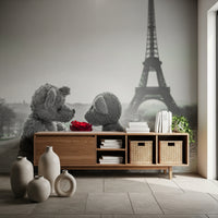 Capture the timeless romance of Paris with this charming wall décor piece, 'Teddy Bears in Love'. This delightful image features two cuddly teddy bears sharing a tender moment, their eyes locked in a gaze of pure affection. A vibrant red rose is offered, a symbol of their enduring love, set against the iconic backdrop of the Eiffel Tower. The scene is rendered in soft grayscale, making the single red rose stand out, adding a splash of passion to the gentle, nostalgic ambience. This heartwarming composition evokes feelings of warmth, comfort, and everlasting love, perfect for adding a touch of sweetness and whimsy to any room. Ideal for nurseries, bedrooms, or any space that could use a dose of romantic charm, this image brings a touch of Parisian magic and the universal message of love into your home.