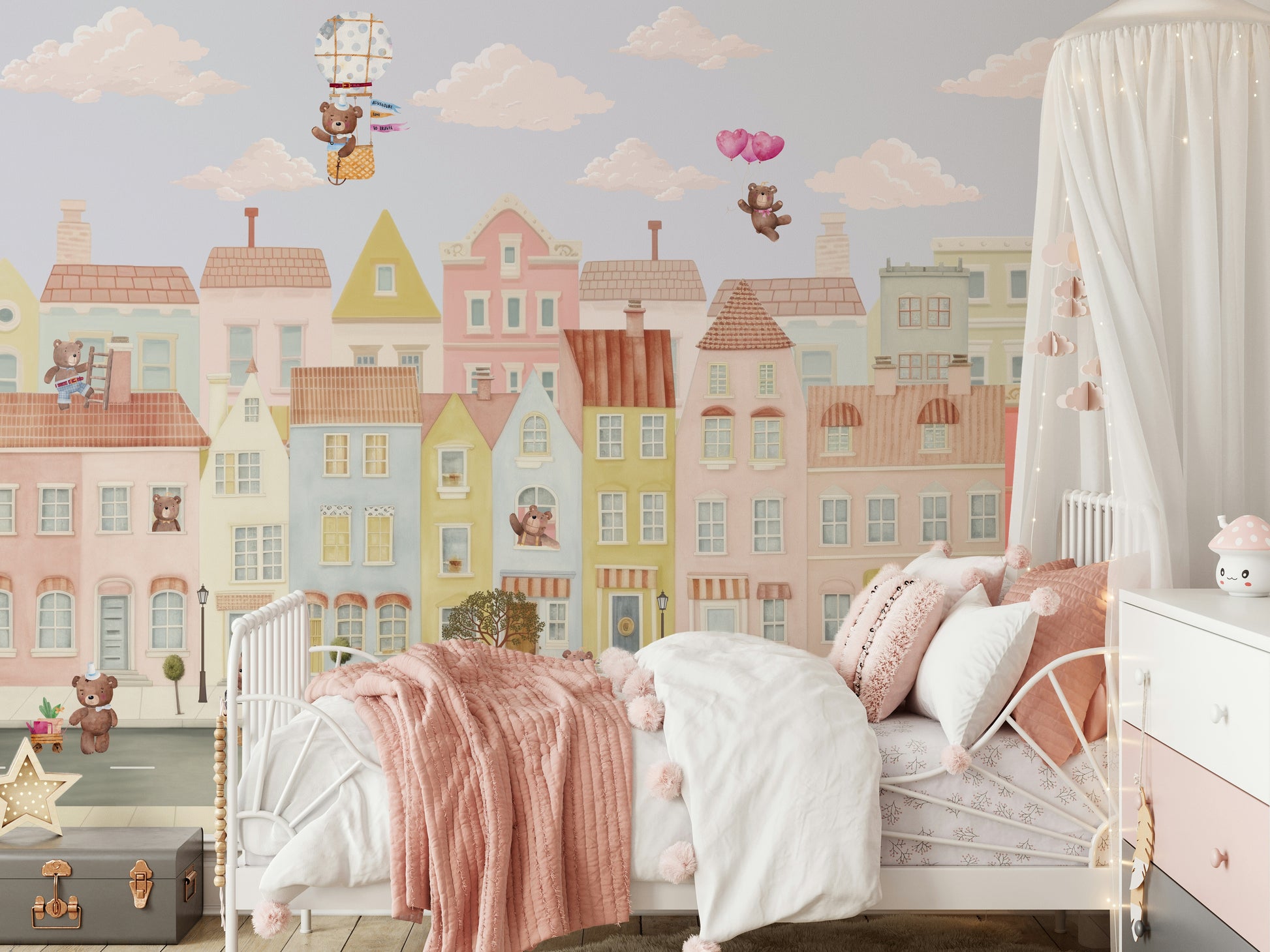 Create a cheerful and imaginative space with this engaging wallpaper for walls. It features a delightful town of pastel buildings occupied by charming teddy bears. Watch the bears enjoy their adventures, from flying high in a hot air balloon to driving in their own miniature cars. This whimsical design is perfect for kids' rooms, playrooms, or nurseries, offering a dreamy escape within your interiors. The soft colours and child-friendly art blend nicely with rooms seeking a happy feel.