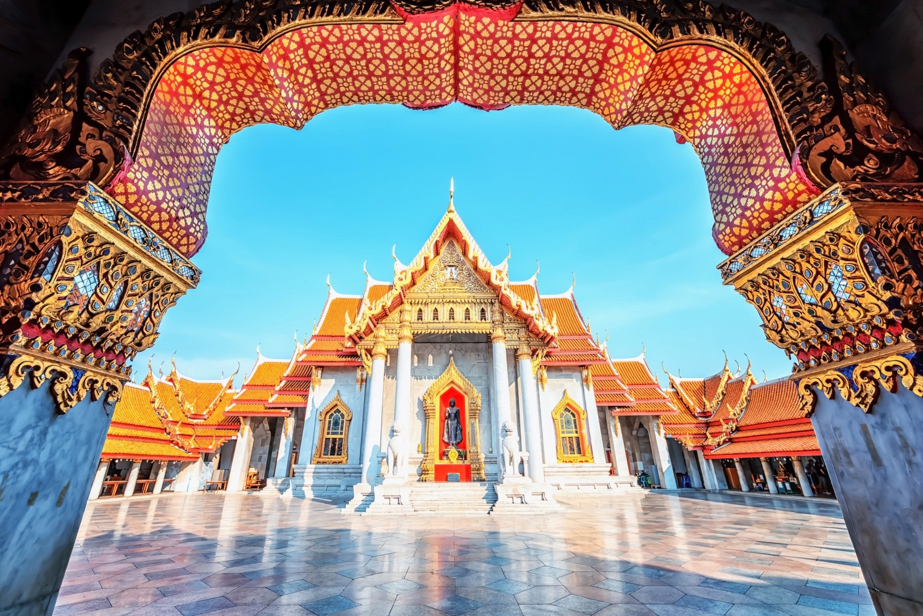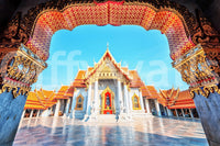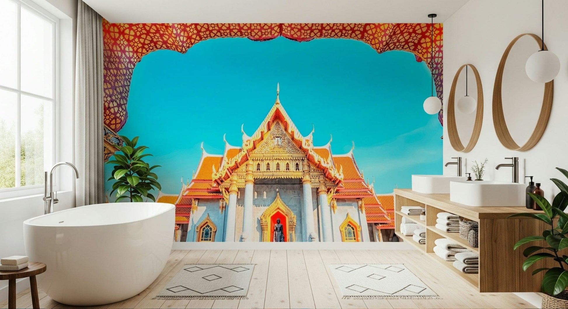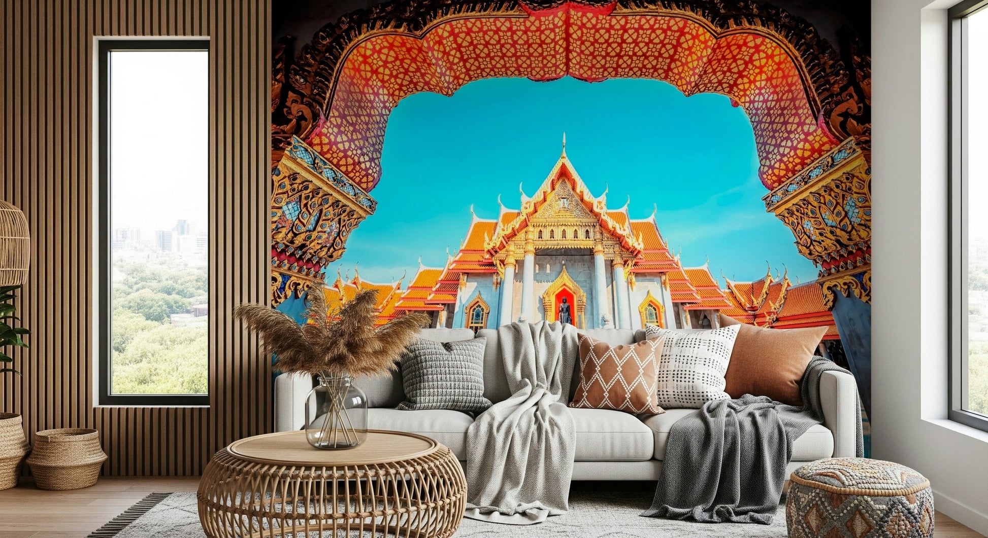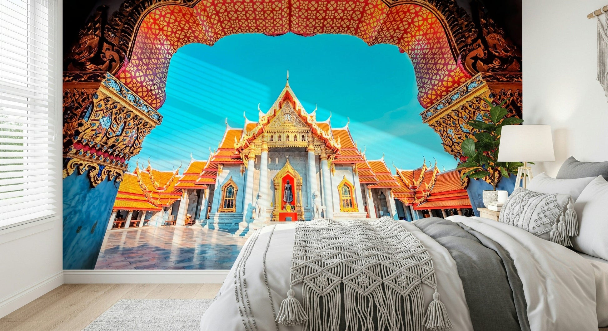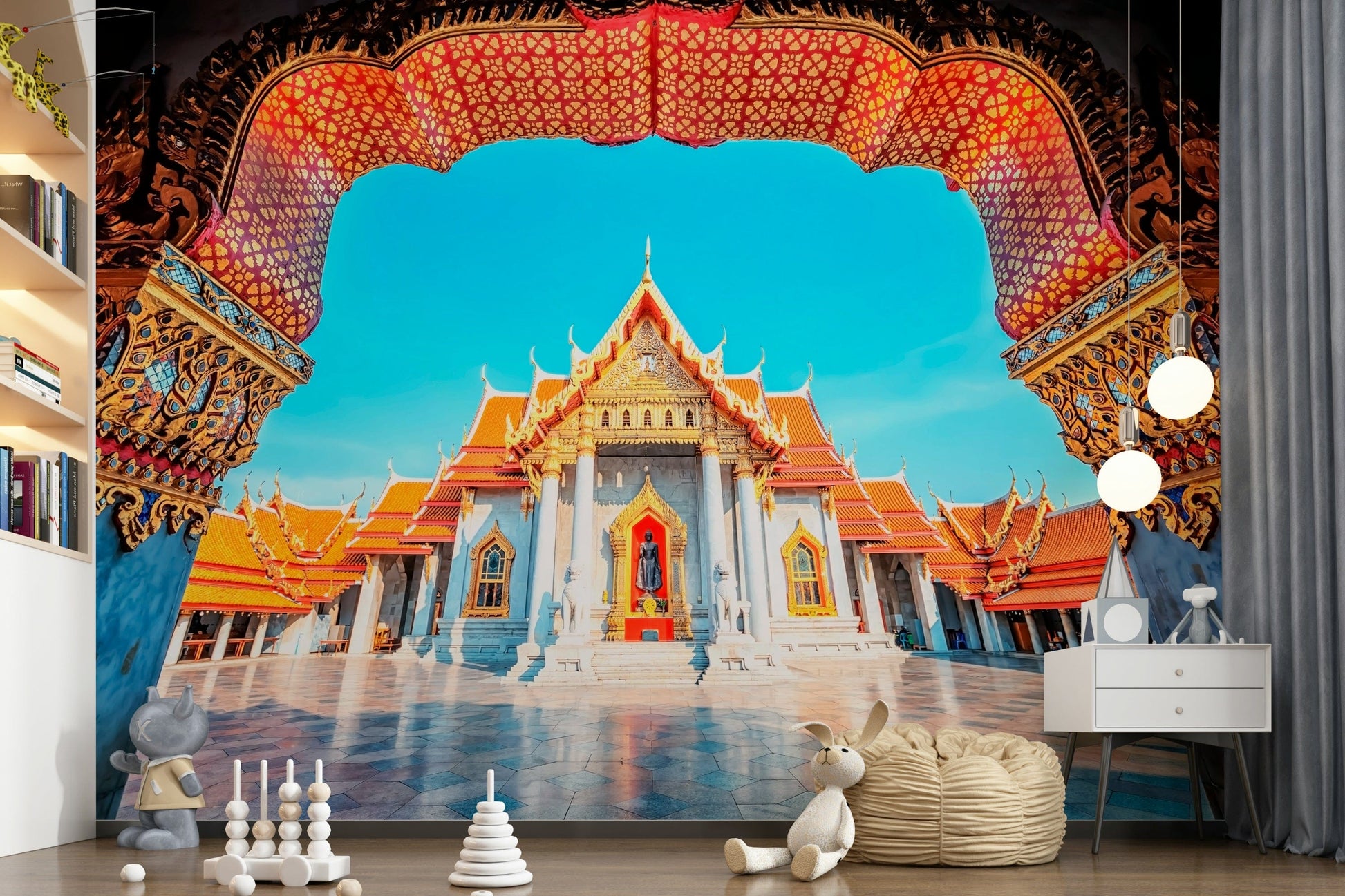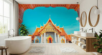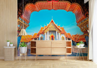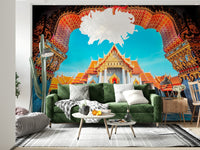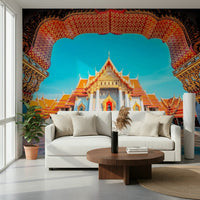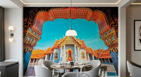 Bring an air of regal beauty into your home with this stunning wallpaper for walls. It features a picturesque view of a golden temple with intricate details, framed by an ornately decorated arch. The vibrant blue sky provides a delightful contrast to the warm, rich tones of the temple and archway. It's a perfect statement piece to transform your living room, dining area, or hallway into a space of cultural elegance. Create a serene and inviting atmosphere that captures the essence of timeless architectural beauty. The design works exceptionally well in spaces where you want to evoke a sense of calm and visual intrigue.
