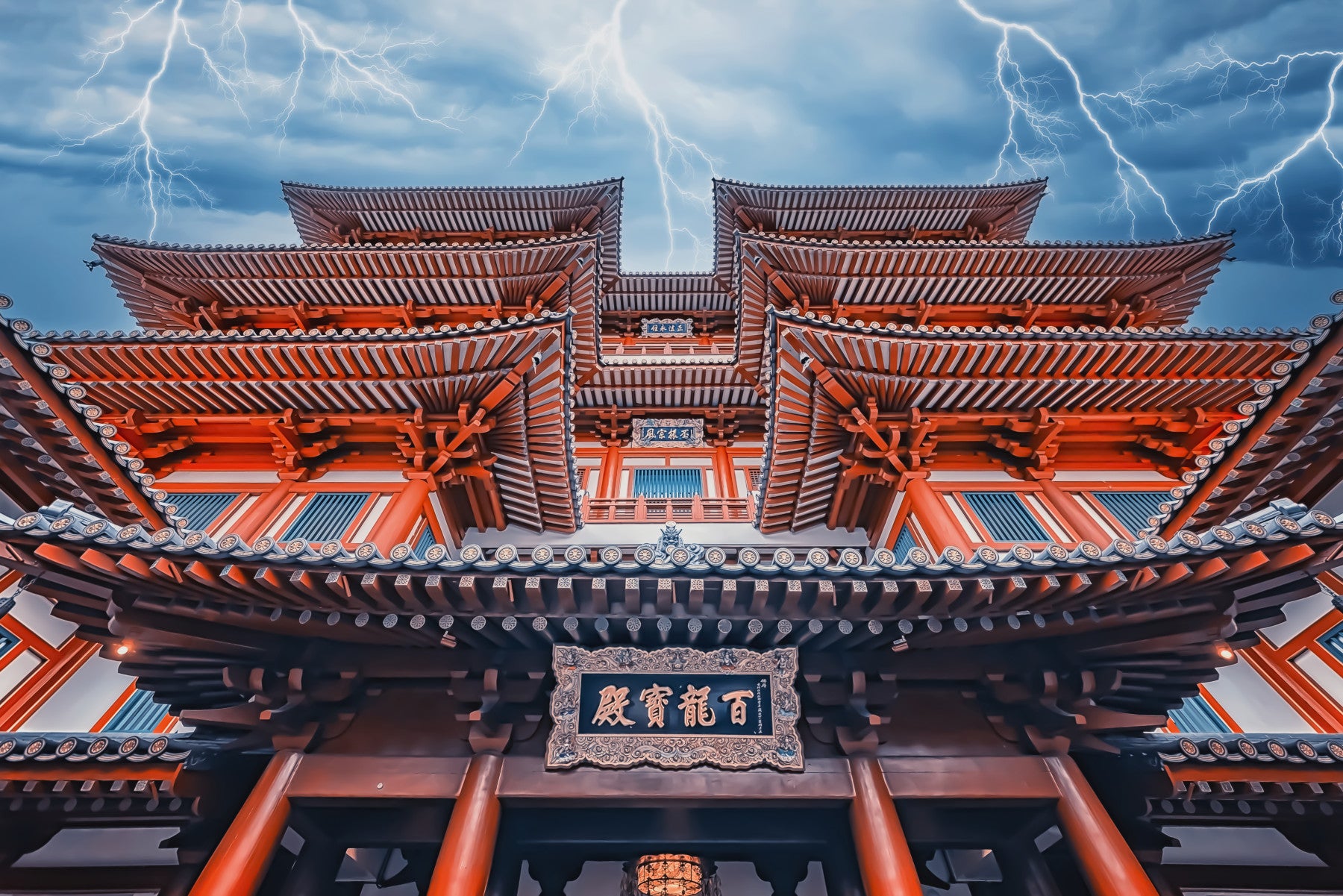 Showcase a bold statement with this stunning architectural wallpaper for walls. The intricate, layered structure of a pagoda against a dramatic sky with lightning creates an intriguing focal point. Rich coral and blue tones add a luxurious, artistic touch. Its bold design complements living rooms, home offices, or entryways, bringing culture and drama indoors.