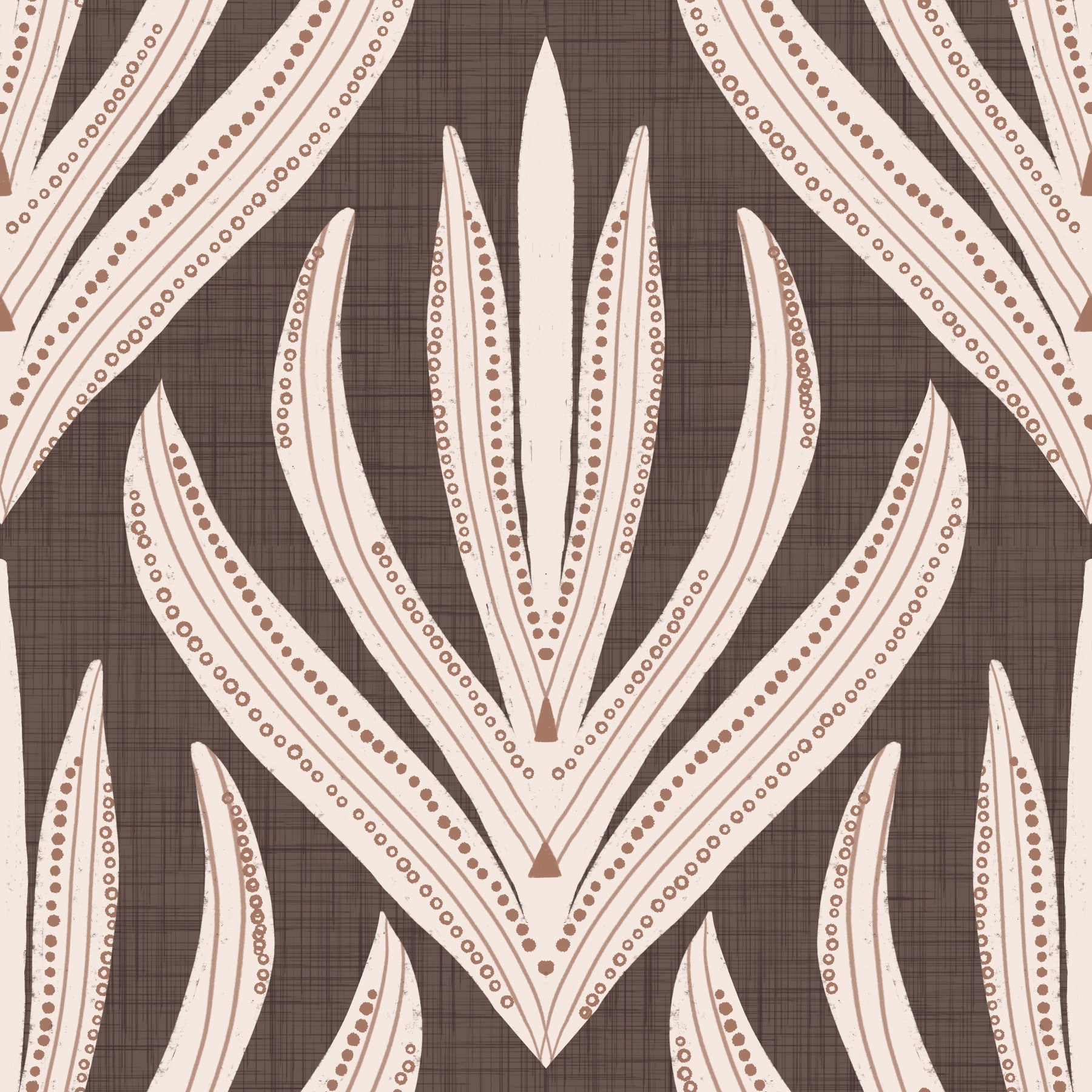 Botanical bohemian wallpaper featuring stylized cream leaves with terracotta accents on a brown base.