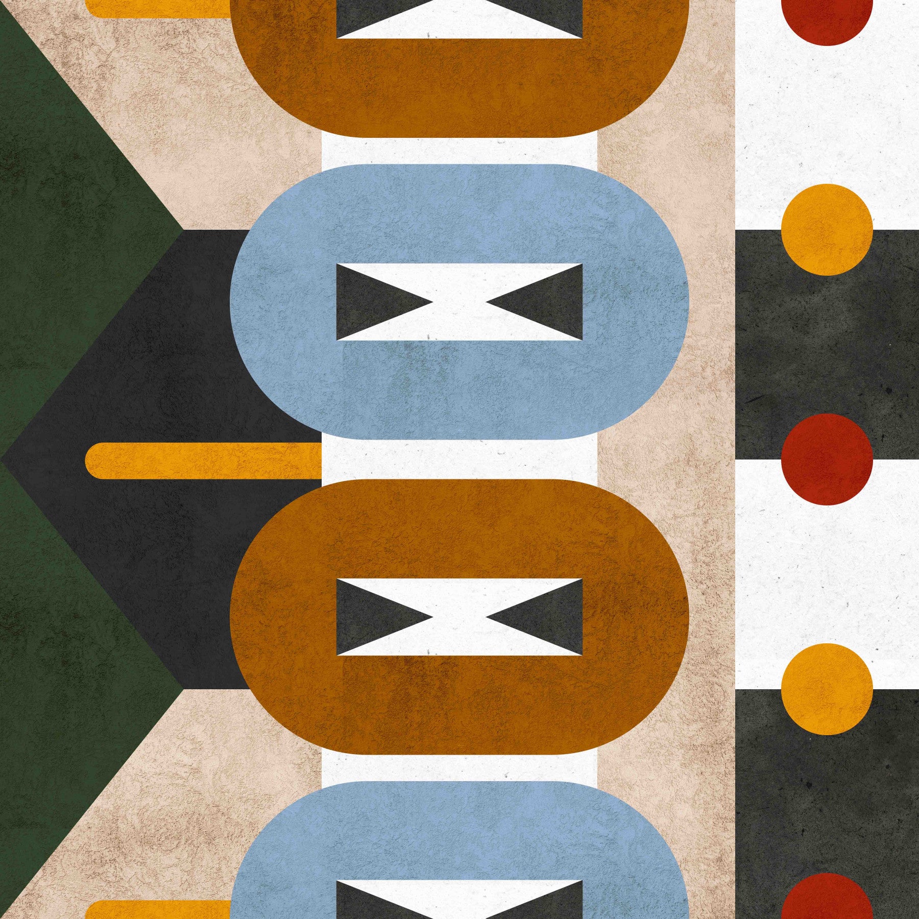 Terra Firma, an abstract wallpaper, showcases a carefully curated palette of browns, blues, greens, and creams, grounding your space with organic sophistication. A textured surface enhances its visual depth, with the juxtaposition of circles, ovals, and triangles arranged in a rhythmic, eye-catching pattern. This design, reminiscent of mid-century modern aesthetics, seamlessly blends retro charm with contemporary style. Ideal for living rooms, studies, or creative studios, Terra Firma injects calm and artistic flair into any interior. Embrace the balanced energy of this unique geometric piece.