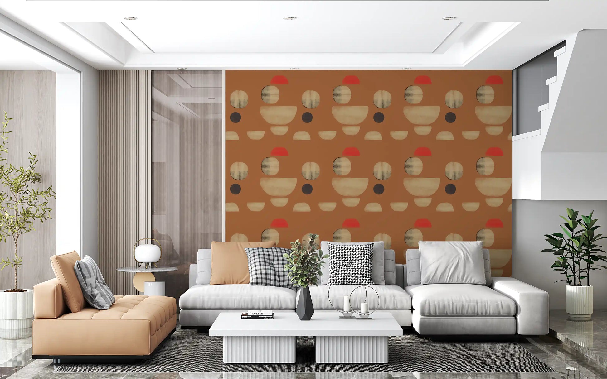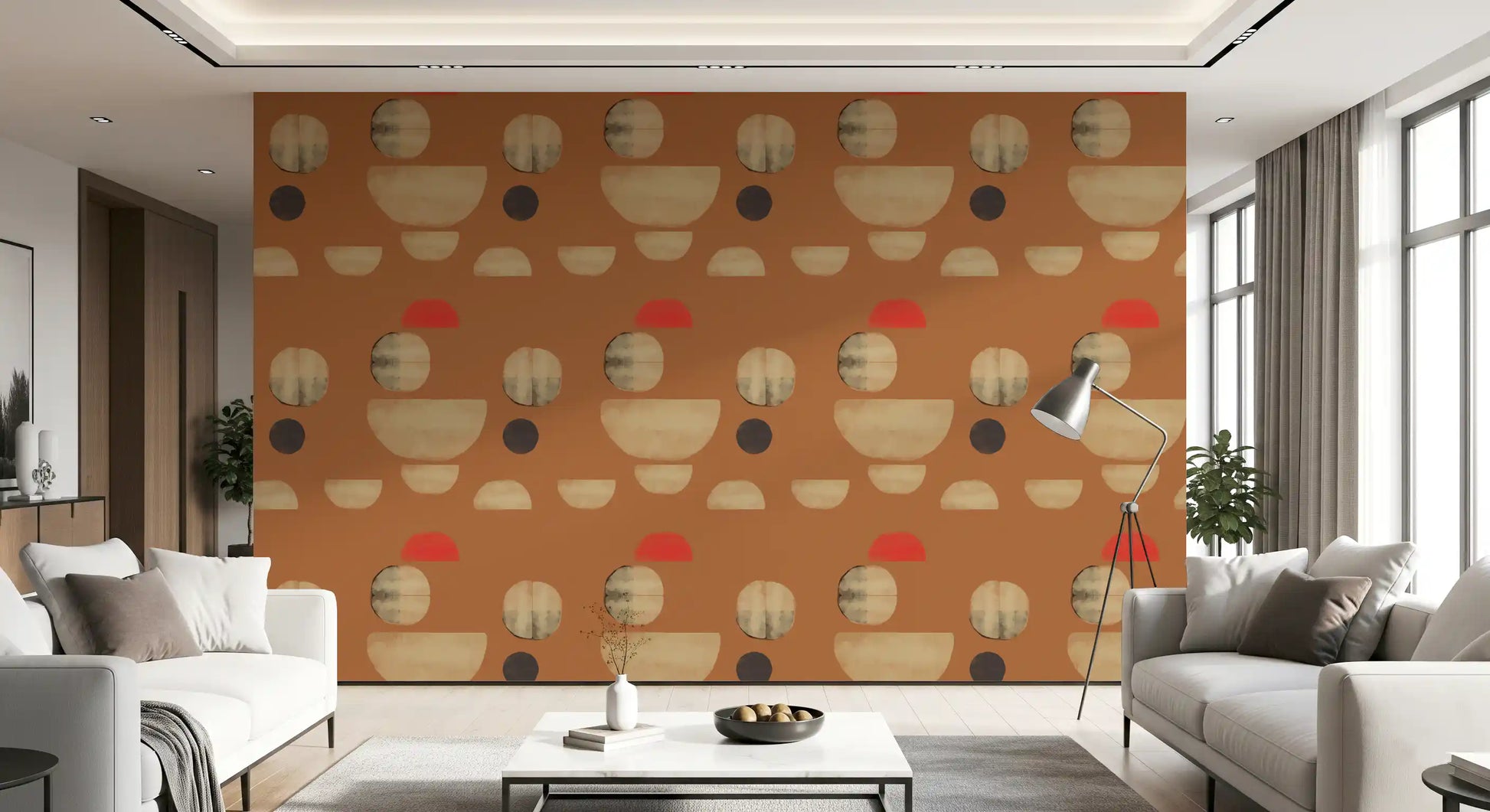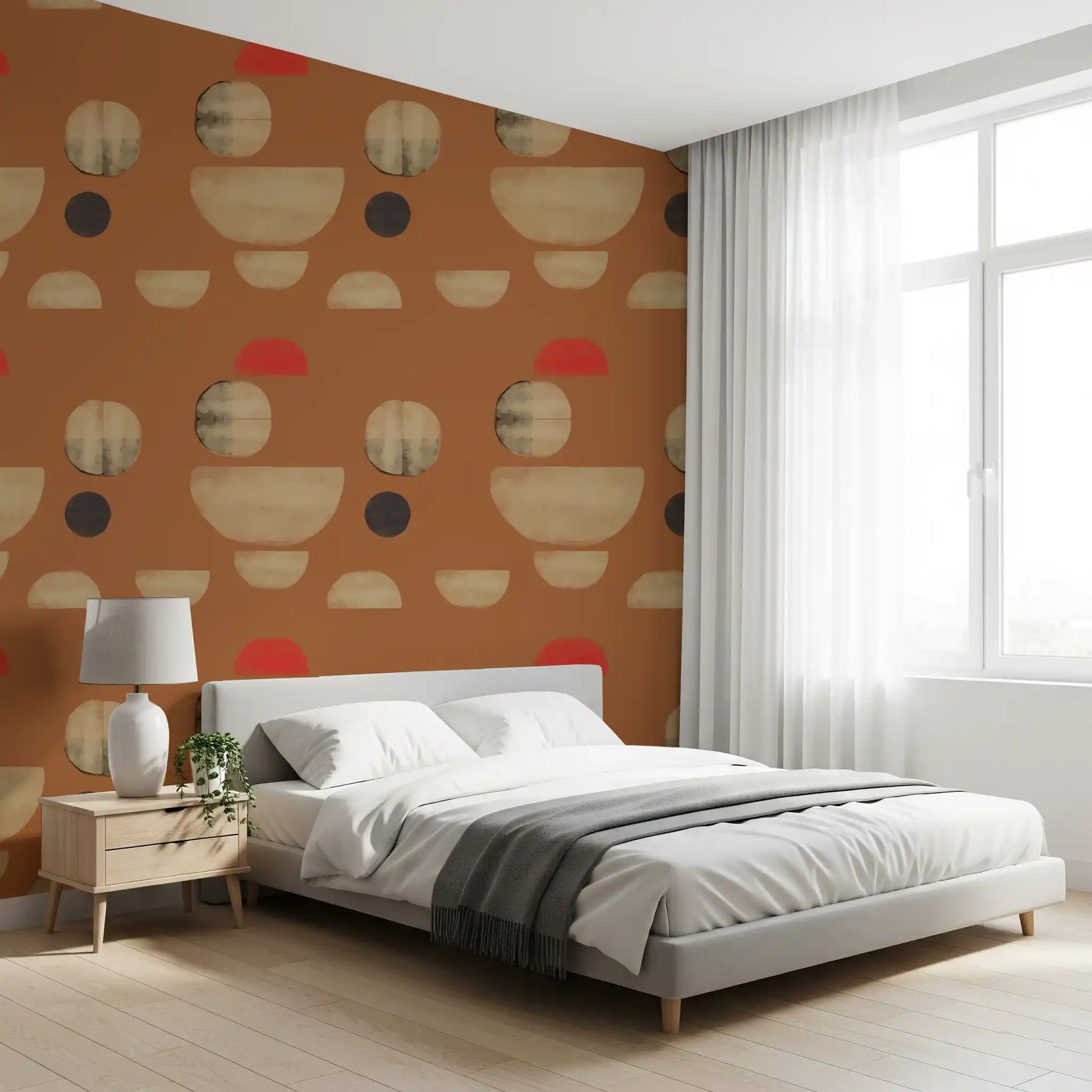 This abstract wallpaper for walls features a compelling arrangement of organic geometric shapes. Rich burnt orange forms the vibrant backdrop, providing a warm and inviting foundation. Overlapping and fragmented circles and semicircles in soft beige, subtle grey, and deep brown create a harmonious visual rhythm. A single, striking coral red accent adds a touch of modern energy. The design’s textured brushstrokes lend an artisanal, tactile quality, enhancing its contemporary appeal. This distinctive wall covering brings sophisticated warmth to living rooms, dining areas, and bedrooms. It also complements a stylish home office or a welcoming hallway, elevating any interior with its artistic, earthy palette and refined abstract composition.
