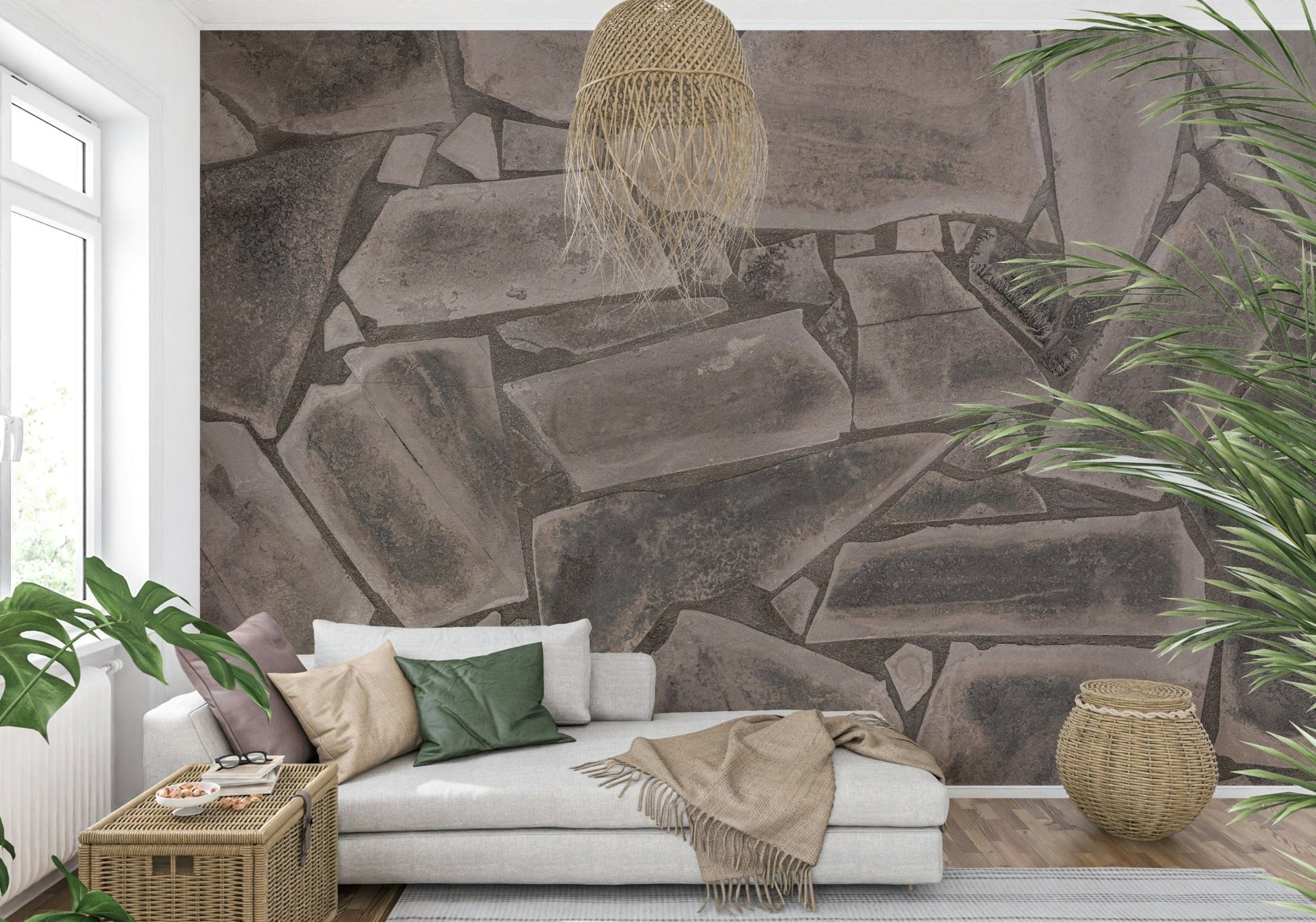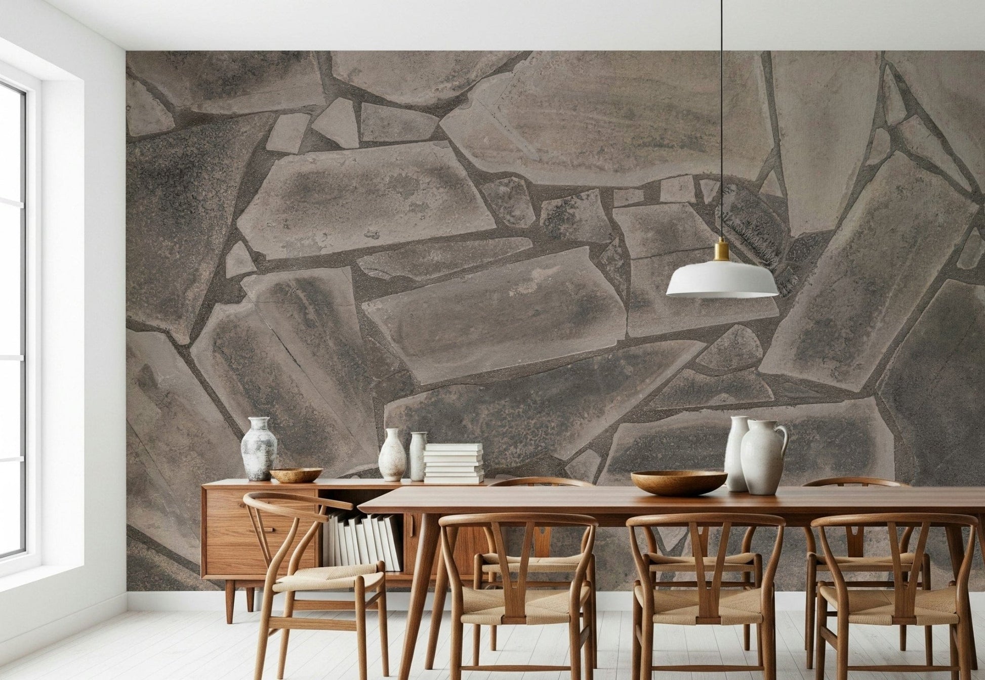 Transform spaces with this design featuring fragmented stones. Subtle grey tones make this a fitting wallpaper for walls in a range of settings. The design adds an organic feel to dining rooms or home offices. Stone details complement various decors. The layout blends into a variety of interior styles, providing a natural, textural dimension to your space.