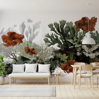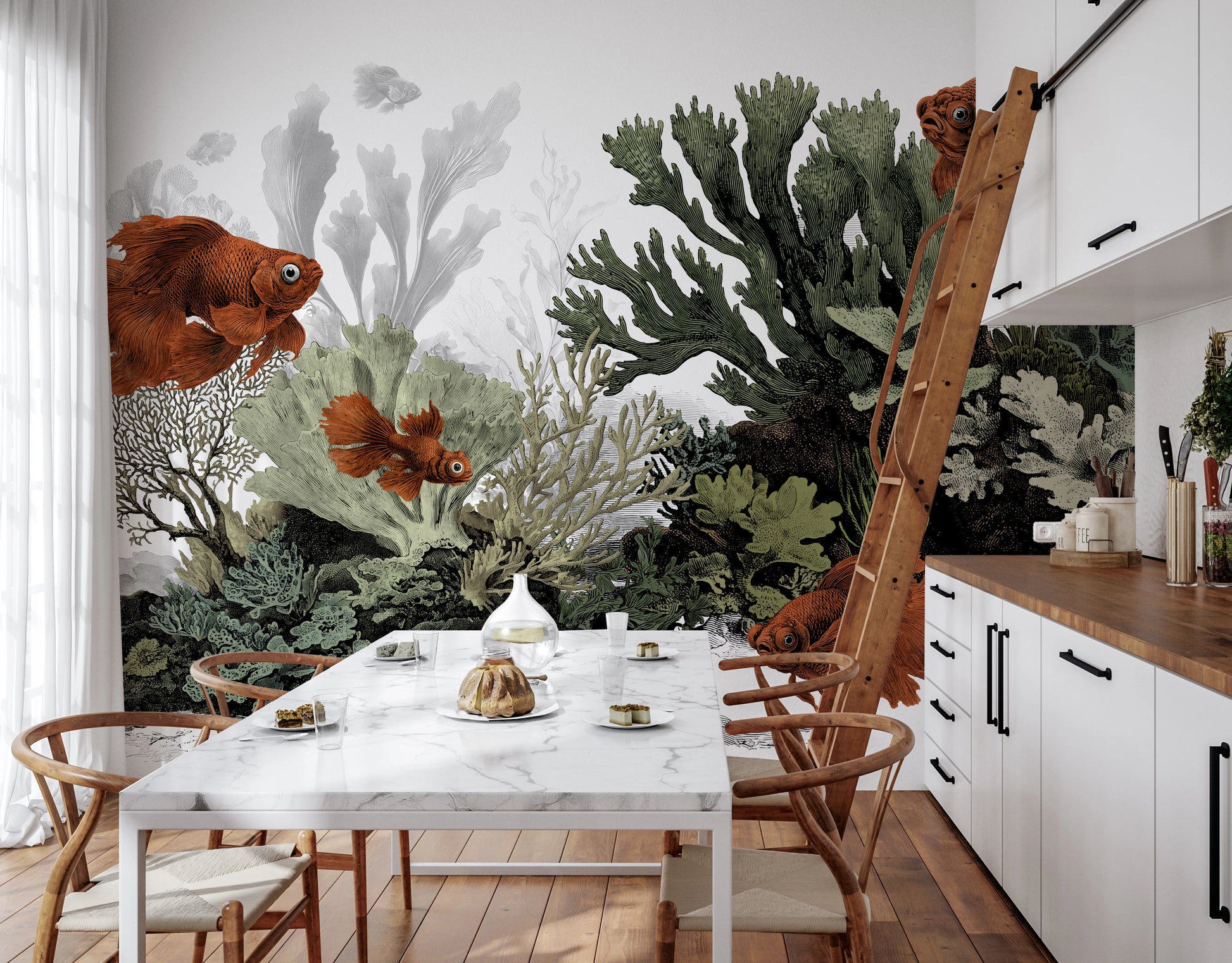The Aquarium - Clean White wallpaper brings a calm underwater vibe with a vintage illustration feel. Rusty orange fish drift through soft sea-foam greens, misty blue-grey water, and detailed coral and seaweed in layered textures. The muted palette keeps it relaxed while the intricate reef pattern adds interest up close. Use this wall mural in a bathroom, nursery, reading nook, or coastal-inspired living room to support an easy, thoughtful interior design scheme.