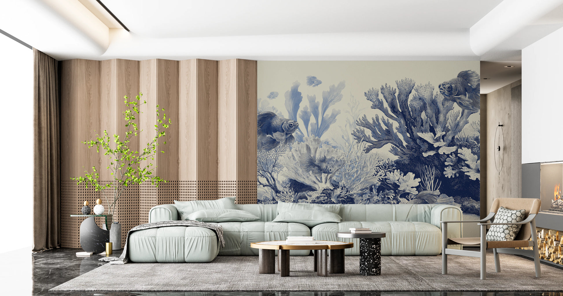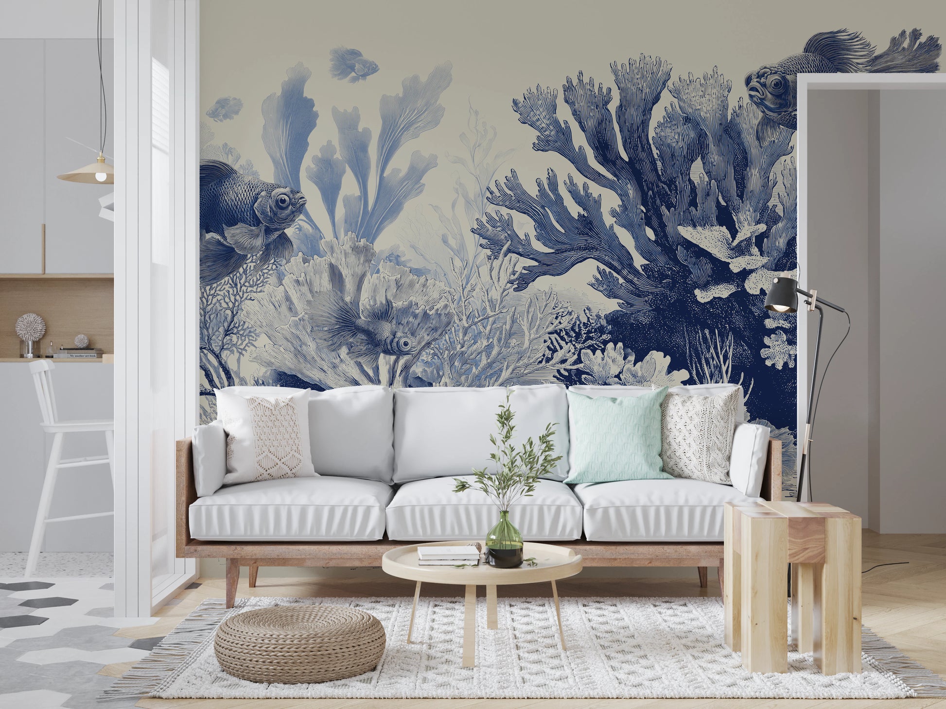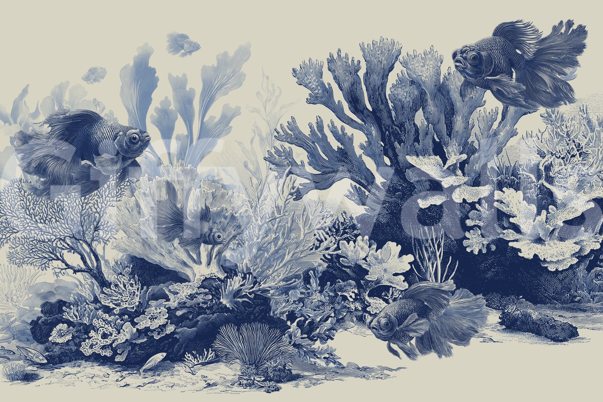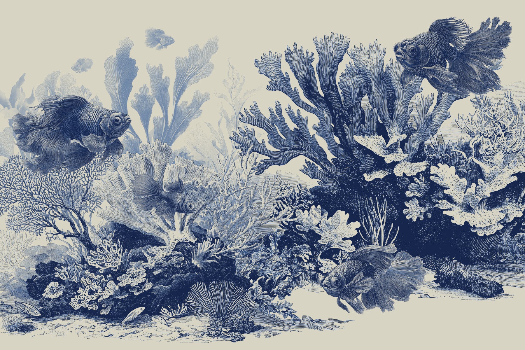 The Aquarium - Delft Blue wallpaper brings a calm, underwater feel to your interior design. Detailed fish glide through a reef of coral, sea fans, and soft plant shapes, all illustrated in a delft blue range on a rich beige background. The pattern has a vintage engraving look that feels both classic and modern. Use this wall mural in a bathroom, bedroom, reading nook, or home office for a soothing backdrop, or in a hallway to add gentle visual interest.