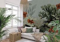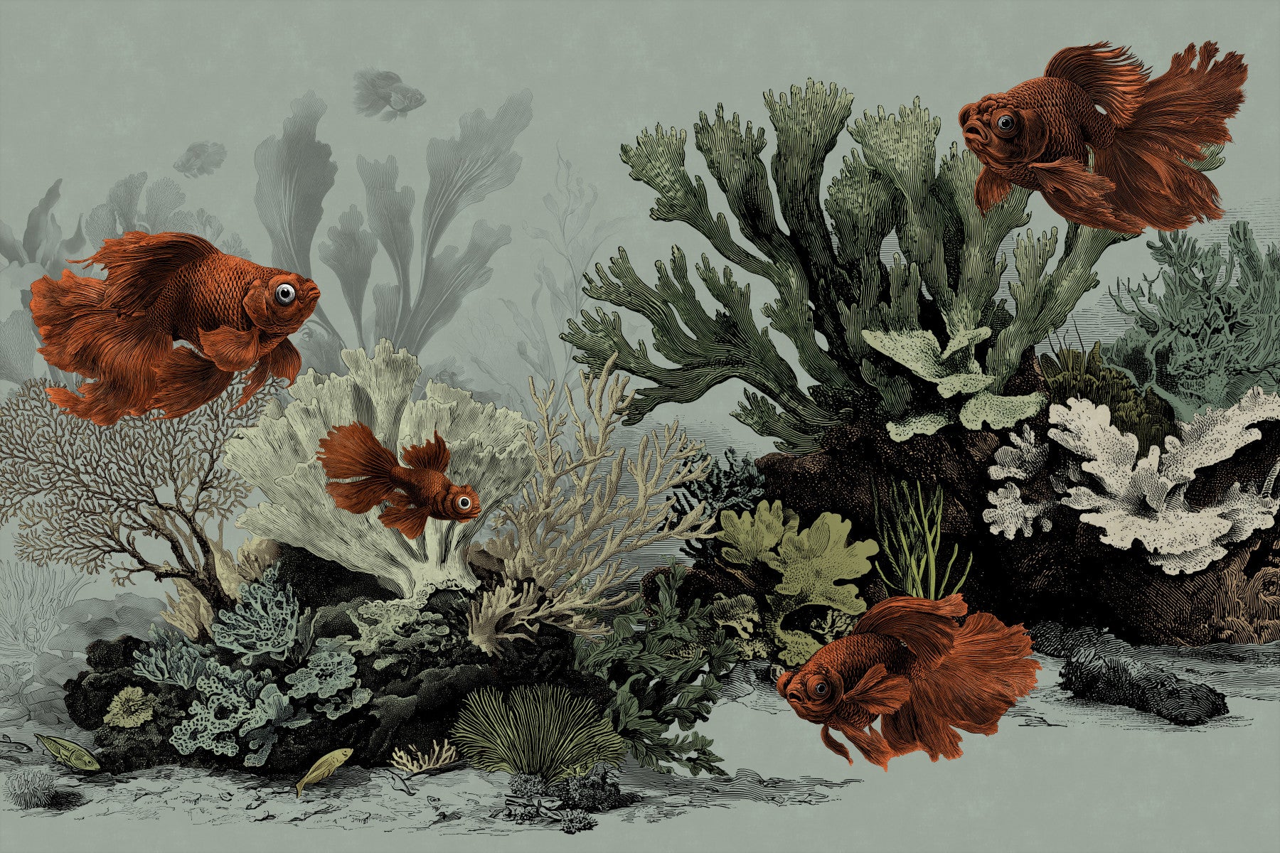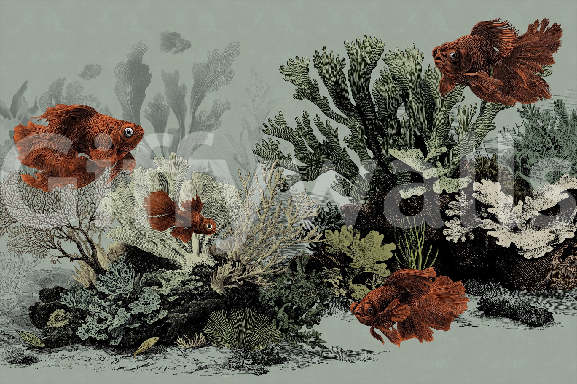The Aquarium - Sea Foam wallpaper brings a calm underwater vibe with a vintage illustration feel. Rusty orange fish drift through soft sea-foam greens, misty blue-grey water, and detailed coral and seaweed in layered textures. The muted palette keeps it relaxed while the intricate reef pattern adds interest up close. Use this wall mural in a bathroom, nursery, reading nook, or coastal-inspired living room to support an easy, thoughtful interior design scheme.