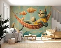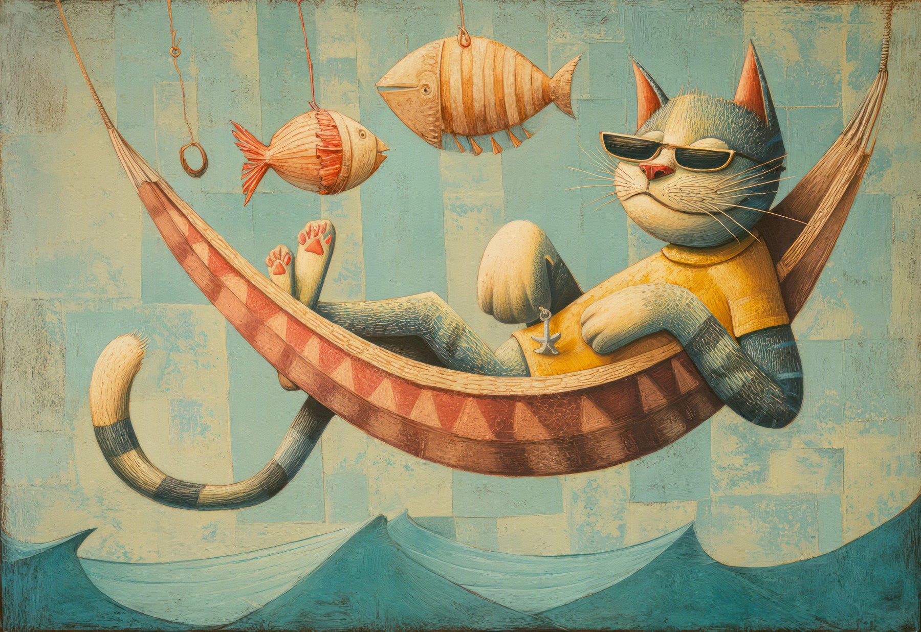 This whimsical artwork depicts a sophisticated cat, donning sunglasses, luxuriating in a vibrant hammock above a tranquil sea. Two playful, stylized fish dangle nearby, adding to the scene's lighthearted charm. The artist's textured brushstrokes create a unique blend of realism and fantasy, resulting in a captivating piece perfect for adding a touch of playful sophistication to any space. The calming teal and warm tones evoke a sense of peace and summery relaxation, making it an ideal addition to bedrooms, living rooms, or any area seeking a touch of playful elegance.