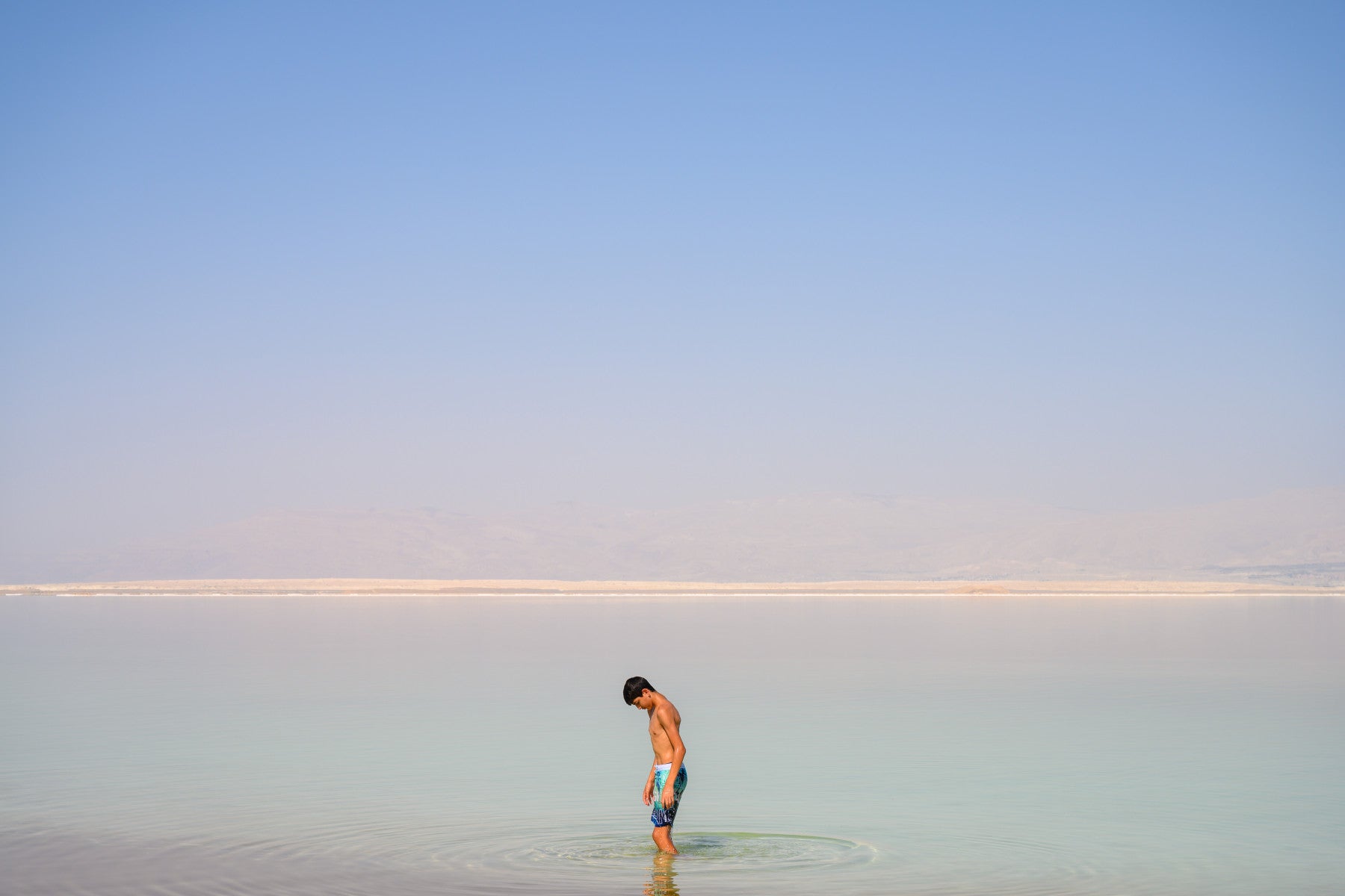Immerse yourself in the serene tranquility of 'The Dead Sea #4'. This captivating wallpaper captures a moment of quiet contemplation on the shores of the iconic salt lake. A young boy stands in the shallow, mineral-rich water, his gaze fixed downwards, perhaps pondering the mysteries of this extraordinary landscape. The pastel hues of the water blend seamlessly with the vast, cloudless sky, creating a sense of peace and boundless space. In the distance, the hazy mountains provide a muted backdrop, emphasizing the isolation and unique beauty of the Dead Sea. The subtle ripples on the water's surface add a touch of gentle movement to the otherwise still scene, offering a visual escape to a place of natural wonder and quiet reflection. Perfect for those seeking a calming and visually stunning addition to their digital space.