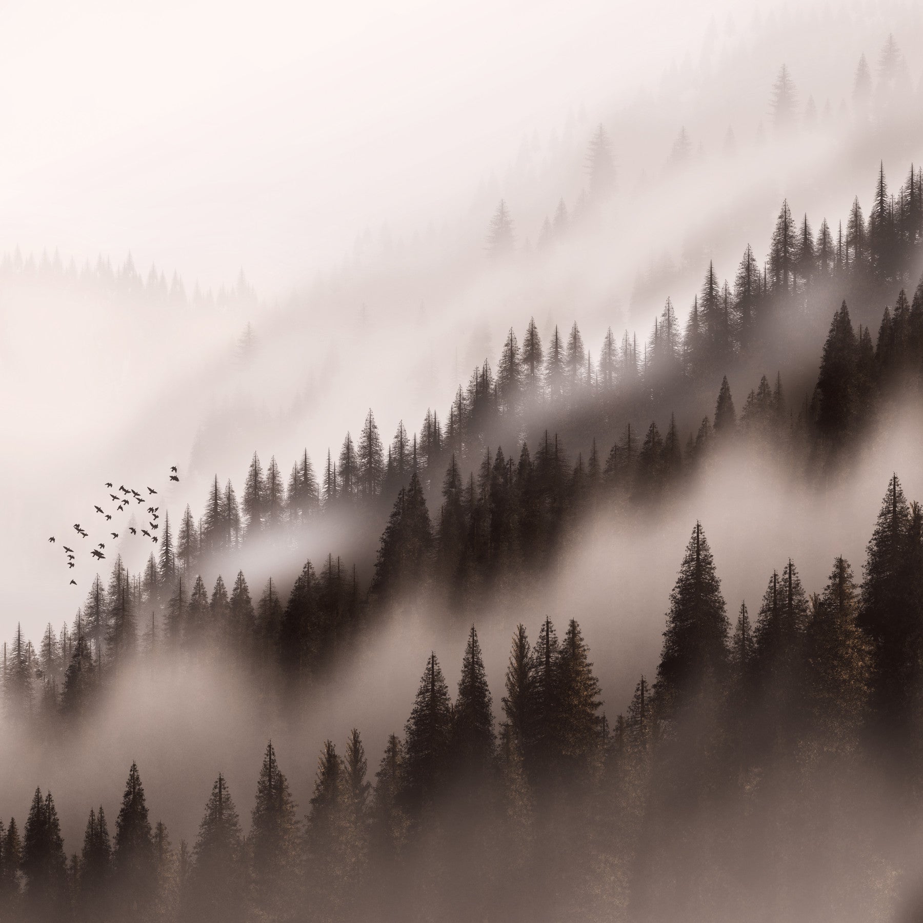 Enchanted Valley Sepia Wallpaper – Pine trees and flying birds illustration