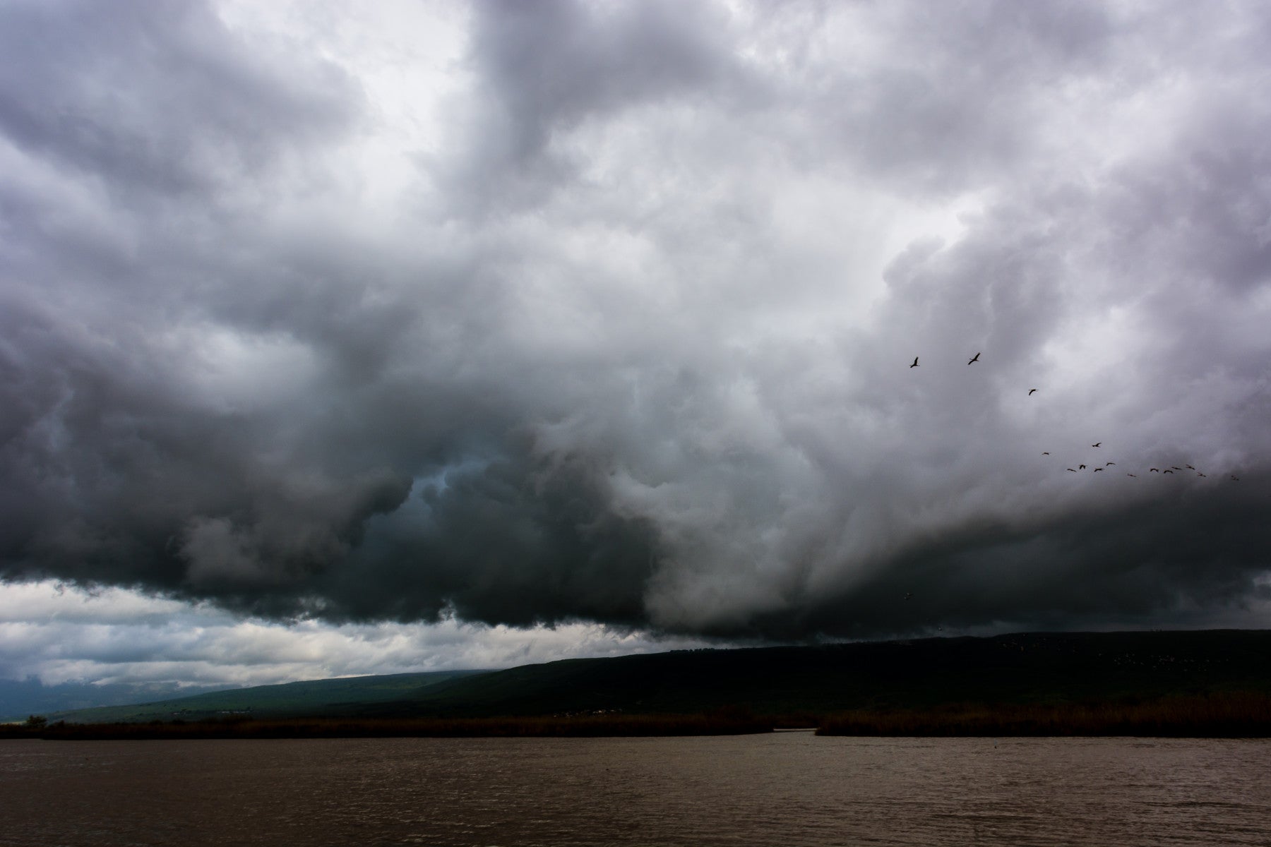 Witness the dramatic beauty of Hula Valley #1, a stunning wallpaper capturing the raw power and serene stillness of nature in perfect harmony. An ominous sky, heavy with storm clouds, dominates the frame, casting a moody atmosphere across the tranquil waters. A silhouette of distant hills provides a contrasting backdrop, emphasising the vastness of the valley. Watch birds fly in formation across the expansive sky, reminding the power of nature. This image embodies a powerful scene, capturing the moments before a downpour. Bring the captivating essence of the Hula Valley to your screen with this arresting visual experience. Perfect for adding a touch of natural drama to your digital space, evoking both tranquility and awe.
