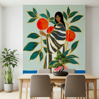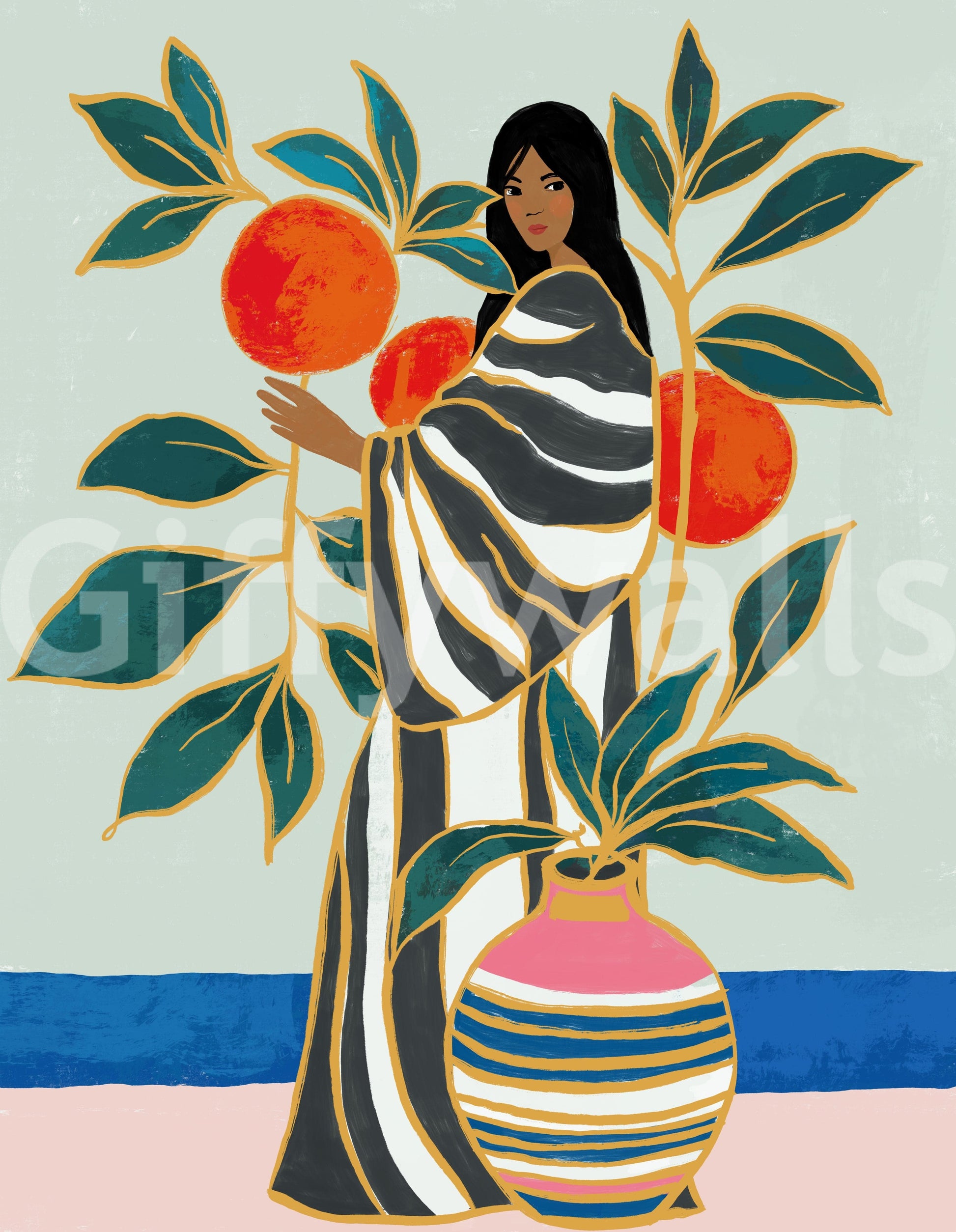 Invite a touch of serene elegance into your space with "The Keeper of Oranges". This captivating piece depicts a graceful figure adorned in a striking striped garment, gently tending to a vibrant orange tree. The bold strokes and warm hues create a sense of tranquility, while the graphic patterns add a modern edge. A stylish vase completes the composition, adding a final flourish to this scene of understated beauty. Envision the way this image will give an inviting and comfortable impression. Ideal for adding a sophisticated and colourful accent to any room, "The Keeper of Oranges" is more than just art – it's a statement. The perfect piece to transform your wall into a gallery. Bring the beauty and bounty of nature indoors with this stunning visual celebration, making your home a welcoming haven.