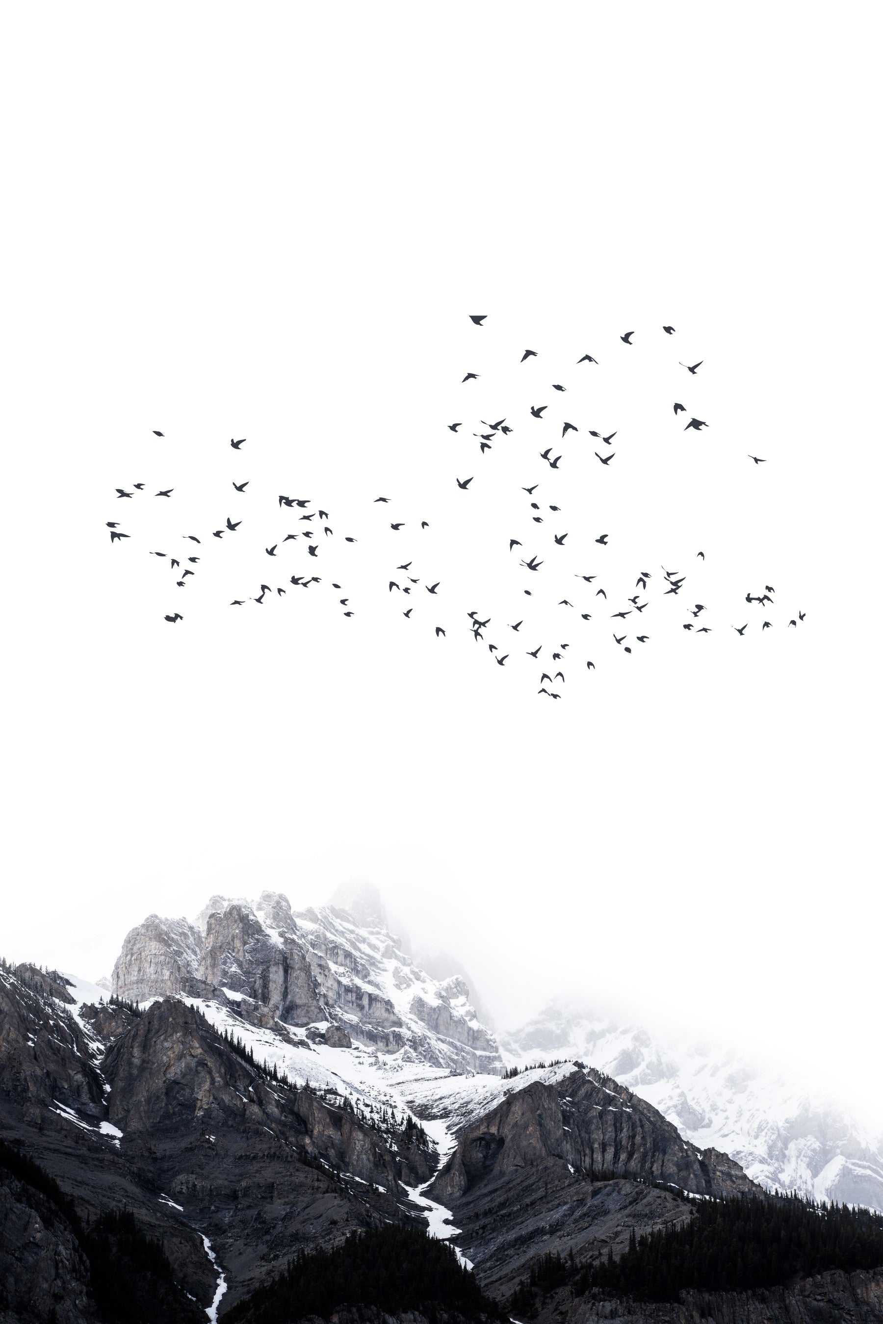 Embrace the serenity of the alpine wilderness with The Mountains wallpaper. This striking image captures a majestic mountain range, partially shrouded in ethereal mist, offering a glimpse into a world of tranquil grandeur. The stark contrast between the snow-capped peaks and the rugged, rocky terrain creates a captivating visual texture, while the dark coniferous trees at the base add a touch of somber beauty. High above, a flock of birds takes flight, their silhouettes dancing against the pale sky, symbolizing freedom and the boundless spirit of nature. This wallpaper invokes a sense of peace and adventure, perfect for adding a touch of wilderness to your digital space. Let "The Mountains" transform your screen into a gateway to the untamed beauty of the natural world.