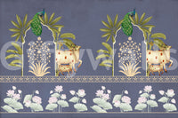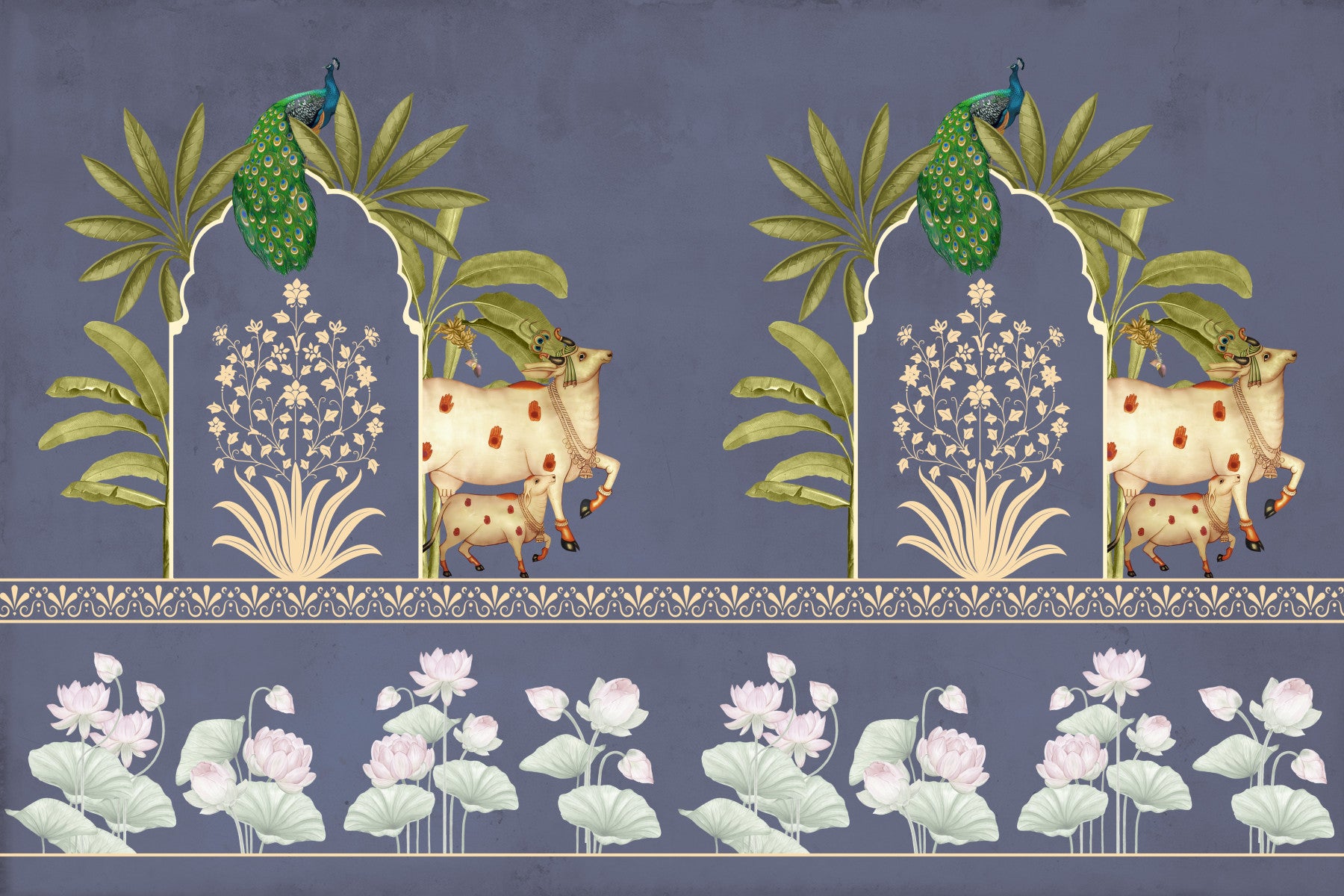 Step into a serene sanctuary with "The Neelambar Arch," a wall covering imbued with the tranquil essence of Indian artistry. The design features an archway framing a scene of stylised flora and fauna. Majestic peacocks perch gracefully atop verdant palm fronds, their jewel-toned plumage a striking contrast against the rich, deep blue (Neelambar) backdrop. Sacred cows, adorned with symbolic markings and traditional jewellery, evoke a sense of reverence and prosperity.
