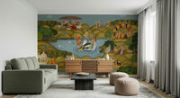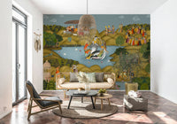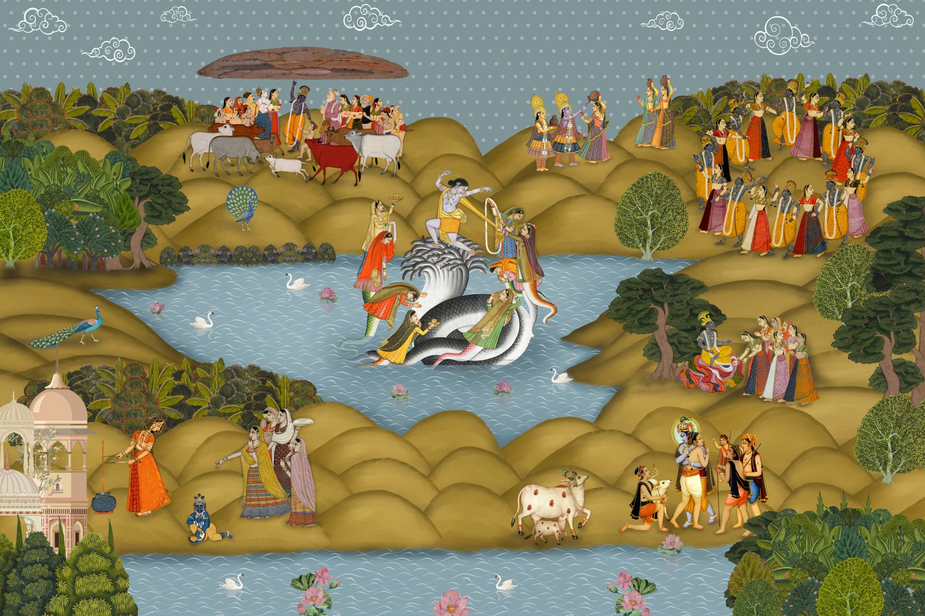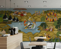 Step into a world of vibrant artistry with "The Palace Jali," a design that echoes the grandeur of royal Indian courts. Imagine walls adorned with a scene teeming with life, a harmonious blend of mythology and nature. This ornate design depicts a flowing river landscape with mythological figures in various activities. Lush greenery and serene water features are brought to life through intricate details and rich, warm colour palettes, reminiscent of classical miniature paintings. The patterns within the architecture are reminiscent of a "Jali". A symbol of heritage, this artwork is more than just a decoration; it's a conversation starter, a window into a timeless narrative, and a testament to refined taste. It is certain to create a space that is both elegant and inviting, transporting you to a realm of beauty and wonder.