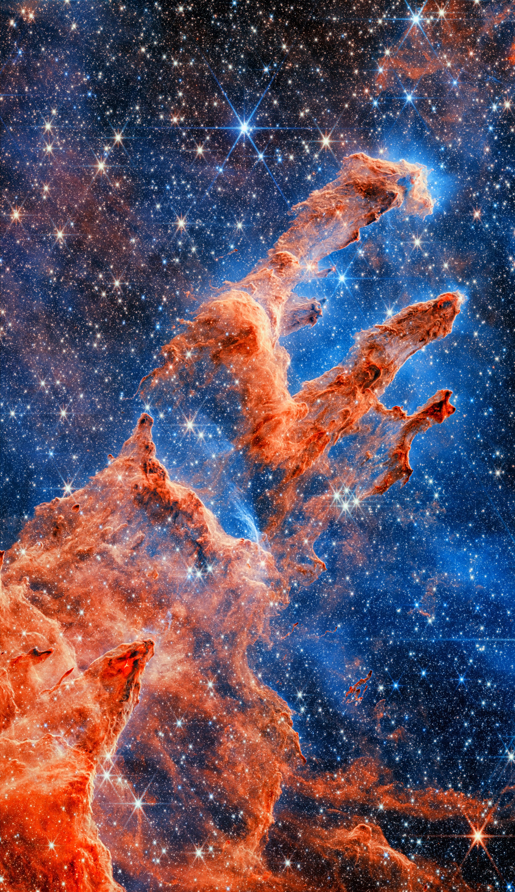 Behold the cosmic majesty of The Pillars of Creation a breathtaking wallpaper that transports you to the heart of stellar genesis. Towering structures of interstellar gas and dust, painted in fiery oranges and ethereal blues, rise against a backdrop of countless stars. This awe-inspiring vista captures the raw power and beauty of the universe, showcasing where new stars are born. The intricate details and vibrant colors evoke a sense of wonder and tranquility, making it a perfect choice for those seeking inspiration and a reminder of the vastness beyond our world. Let "The Pillars of Creation" transform your screen into a window onto the cosmos, igniting your imagination and fueling your dreams with the boundless possibilities of the universe.