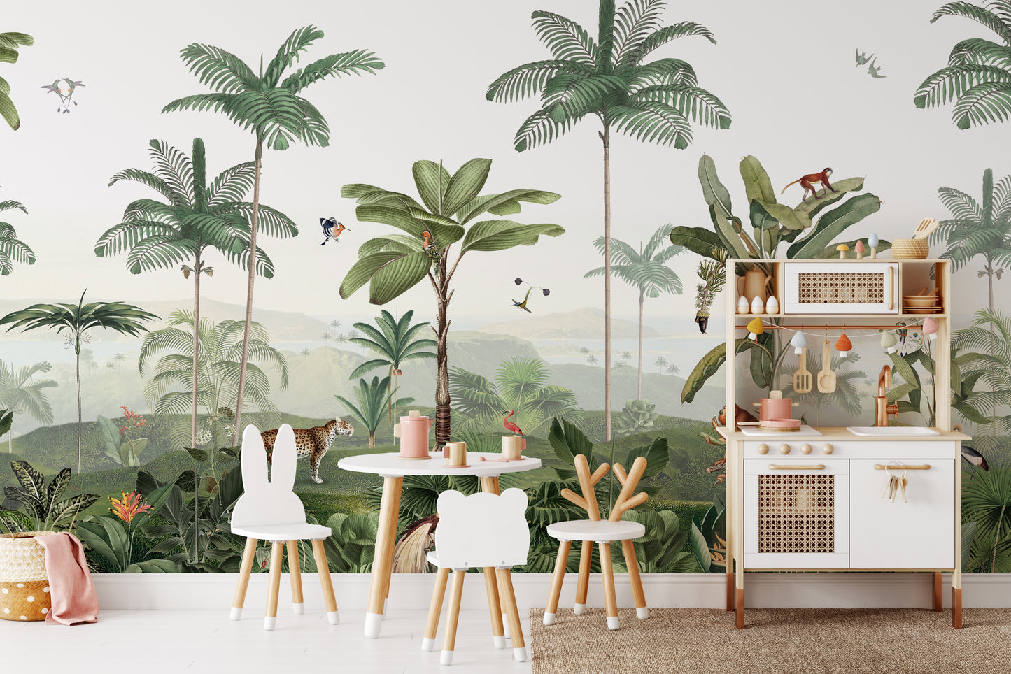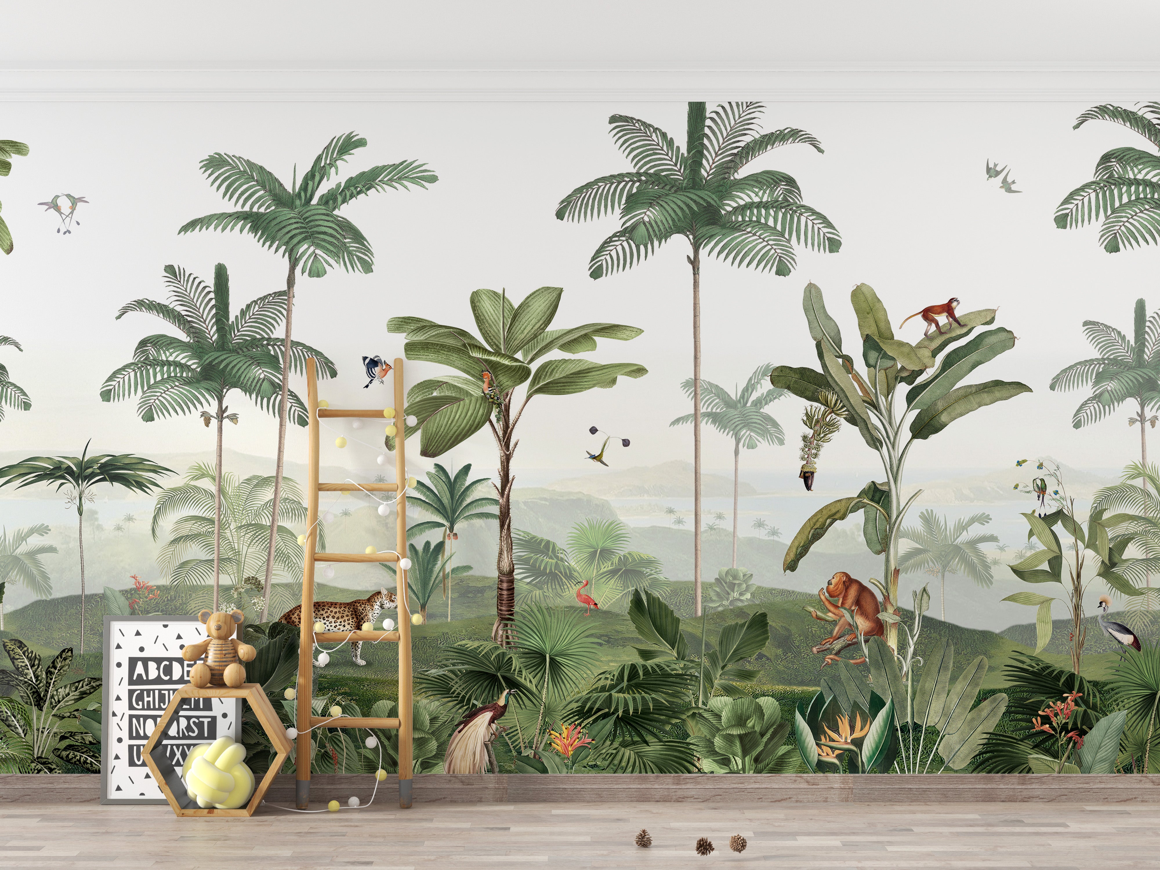 Wildlife and palm trees Thrilling Tropics mural wallpaper design
