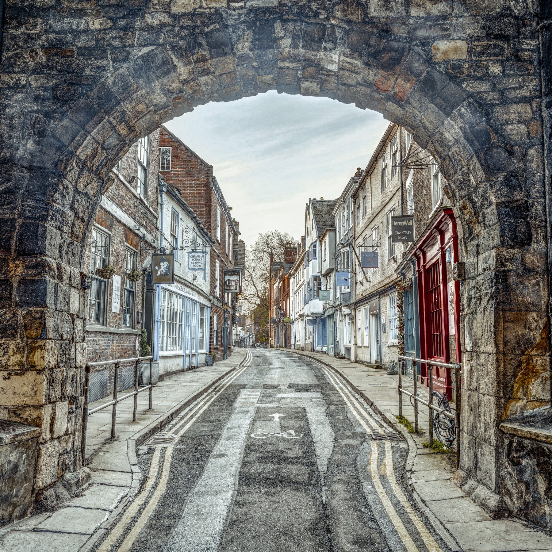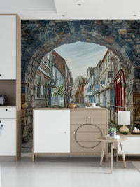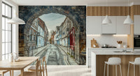 Journey down a charming historic street framed by a majestic stone archway. The scene showcases a blend of textures from weathered stone to brick buildings. Subtle colours create a calming atmosphere. The design evokes a sense of history and timeless style. Use this wallpaper for walls to add depth and interest to your home. This image works great in a study, hallway, or even a bedroom, bringing a classic, sophisticated element to your interiors.