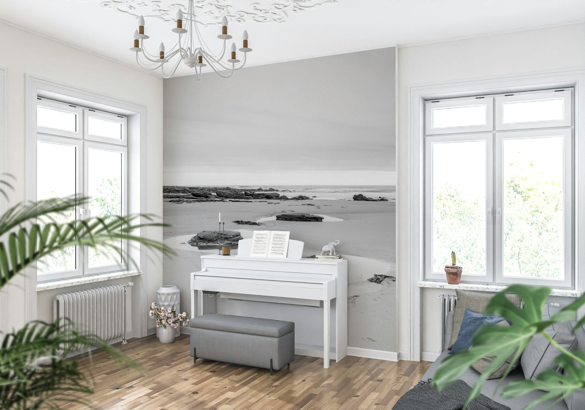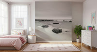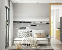 Rock pools on a sandy beach. Capture the serene beauty of the coast with "Tide Pools," a monochromatic masterpiece that evokes a sense of calm and timeless elegance within any space. This art piece portrays a tranquil beach scene, where the receding tide leaves behind shallow pools reflecting the muted sky above. Jagged rocks, softened by the rhythmic ebb and flow, stand as silent sentinels amidst the vast expanse of sand. The interplay of light and shadow accentuates the textures of the landscape, highlighting the granular details of the sand and the rugged surfaces of the rocks. Let the quiet strength of the ocean transform your walls into a serene haven, offering a peaceful retreat from the everyday.