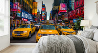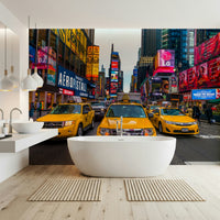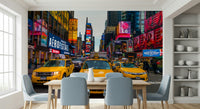 Taxis on Broadway, New York. Experience the electric energy of Times Square with this lively wallpaper for walls. Vivid yellow taxis navigate the bustling streets, surrounded by towering billboards blazing with colour. The composition captures the essence of New York City's vibrant atmosphere, bringing an urban edge to any room. This design works well in modern living rooms, creative offices, or teen bedrooms, adding a dynamic focal point that complements contemporary interiors. It creates an energetic and stylish backdrop, perfect for spaces that celebrate city life.