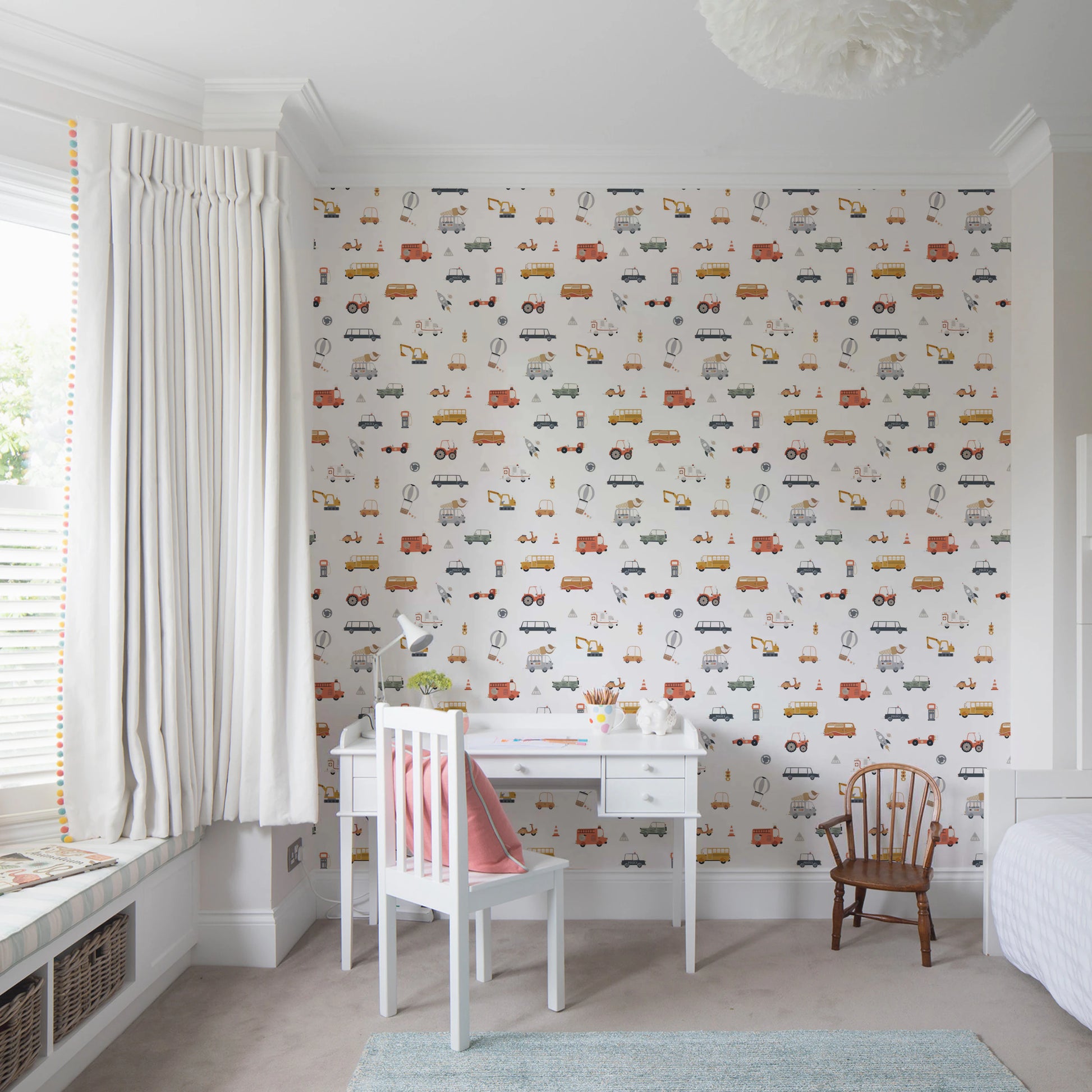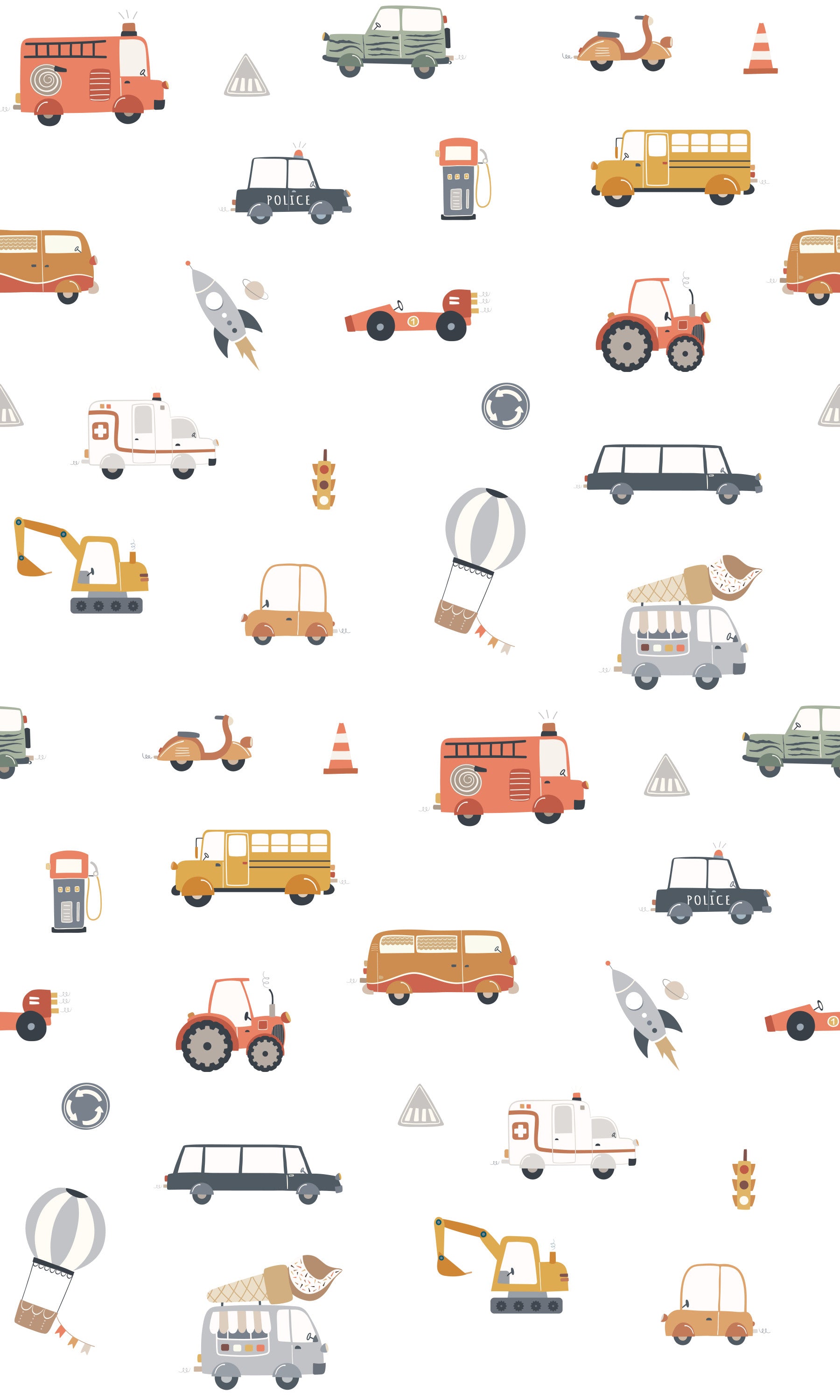 Transform your space with this delightful wallpaper for walls. This cheerful design features an array of colourful vehicles, including fire trucks, school buses, police cars, ambulances, and quirky ice cream vans. The simple, cartoon style adds a playful touch, perfect for igniting creativity in any child's space. Soft shades of red, yellow, blue, and beige create a soothing and inviting atmosphere. It’s an excellent choice for a kids' room, nursery, or playroom, bringing a sense of fun and adventure. It enhances interior spaces by creating a happy and dynamic environment. Use it to design a feature wall or to cover entire rooms.