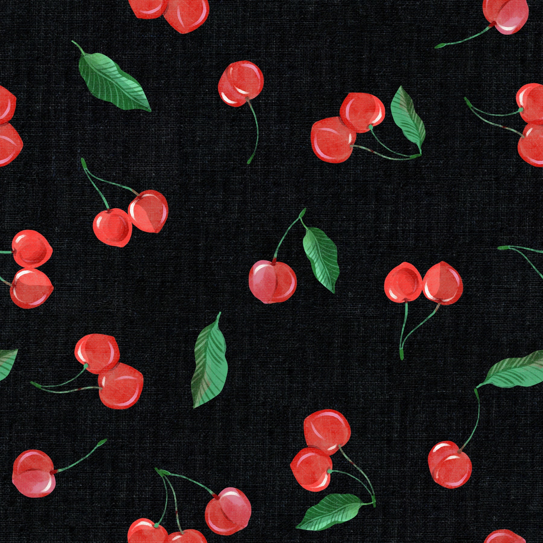 Experience the captivating allure of 'Toss Black Painterly Cherries,' a digital wallpaper that exudes a dark, romantic charm. Vibrant red cherries, rendered in a painterly style with visible brushstrokes, are playfully scattered against a deep black linen-textured background. The cherries, some appearing in pairs, others singly, are interspersed with stylized green leaves, adding a touch of nature's elegance to this sophisticated design. The contrast between the rich red and the dark background creates a striking visual impact, perfect for adding a touch of playful sophistication to your digital devices. This wallpaper’s painterly texture and subtly scattered fruit pattern is both modern and timeless.