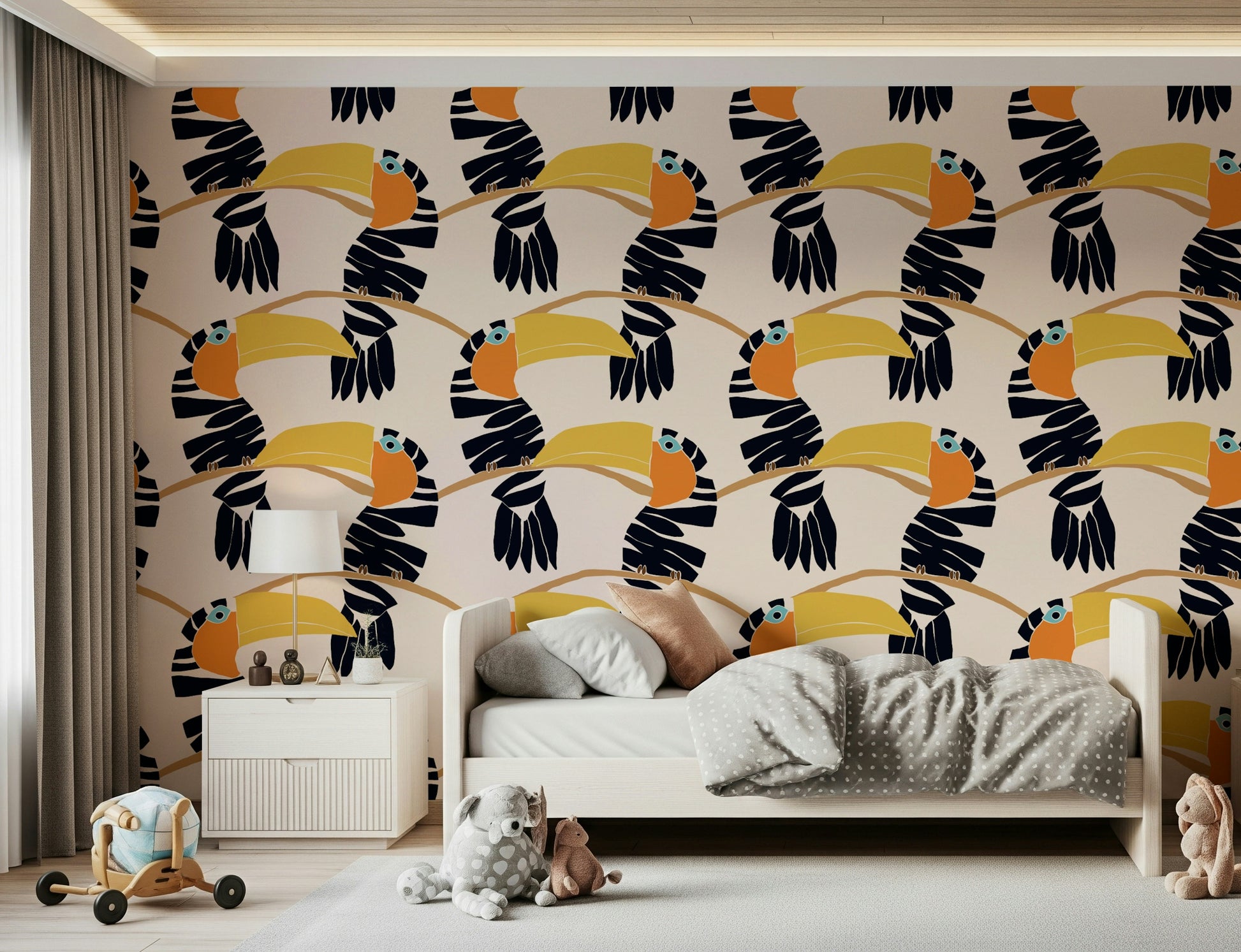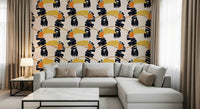 Elevate your walls with this vibrant toucan-themed wallpaper for walls. The bold, simplified shapes and rich colour palette brings a playful, modern aesthetic to your interior. The stylised toucans sit on branches in a seamless pattern. Ochre yellow, bright orange, and deep navy provide striking contrast against the soft beige background. This wallpaper will add charm to a living room, nursery, or hallway. It will energise the space while providing a touch of nature-inspired style. This design complements modern, minimalist, and eclectic decor, transforming any room into a joyful and inviting sanctuary.