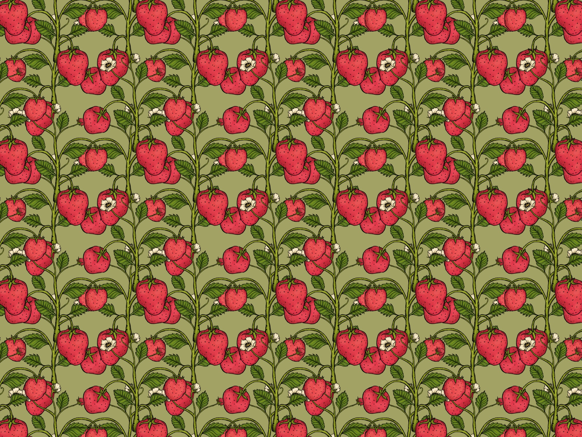 Trailing Strawberries Pink and Green Color Wallpaper
