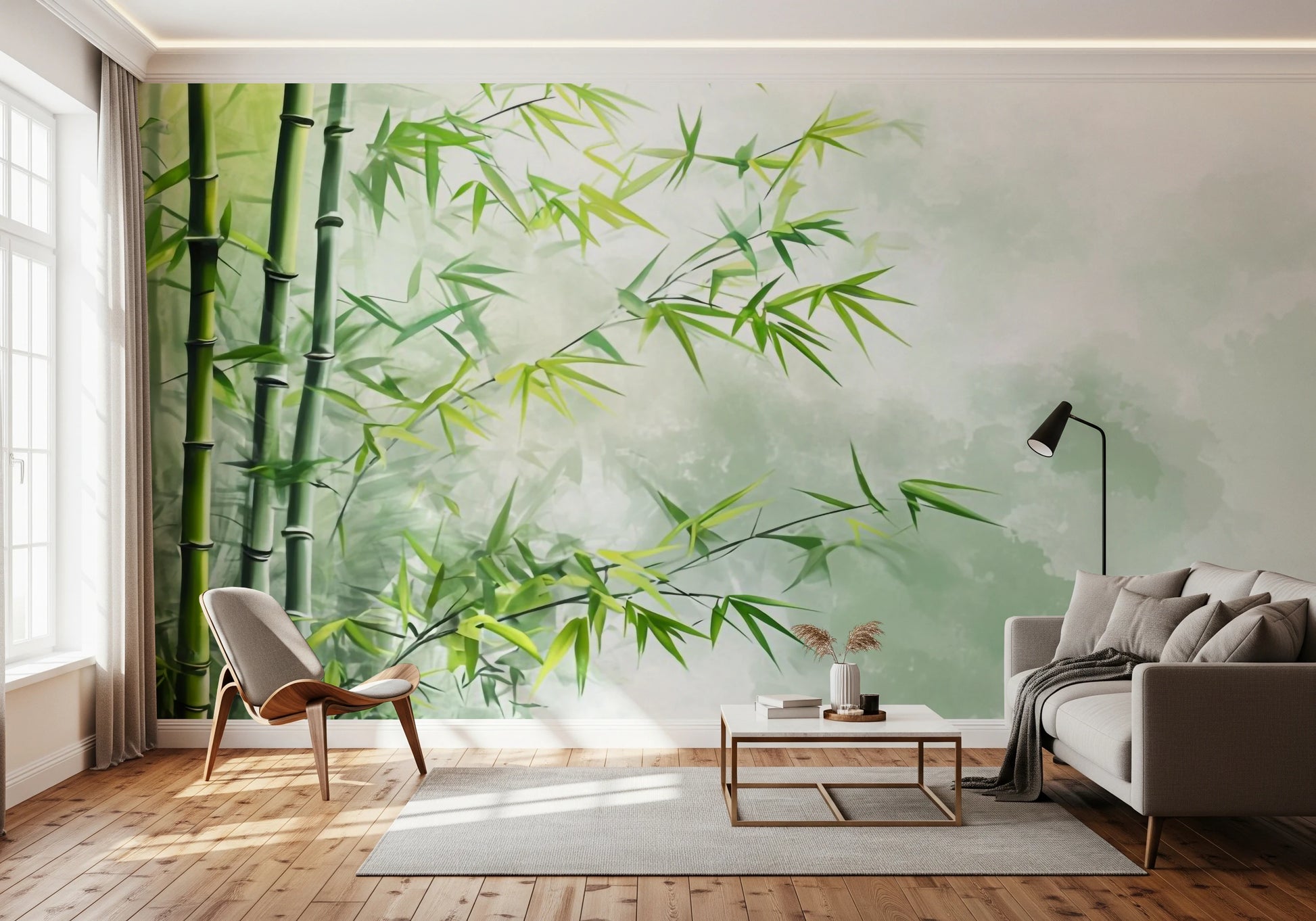 Bring the outdoors in with this soothing, bamboo-themed wallpaper for walls. Featuring a soft, watercolour effect in shades of green and white, this design creates a tranquil and airy atmosphere in any room. The gentle depiction of bamboo stalks and leaves lends a touch of natural elegance, ideal for living rooms, bedrooms, or bathrooms. Its versatile colour palette complements a variety of interior styles, from modern to rustic, adding depth and visual interest to your walls. This wallpaper introduces a sense of calm and serenity to your home, making every day a peaceful retreat.