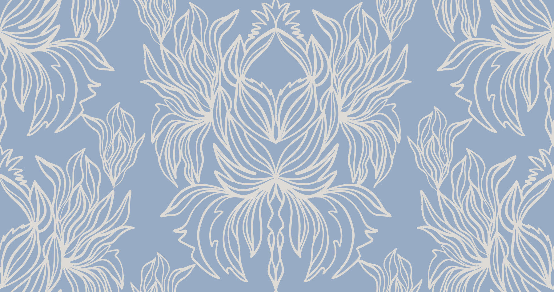 Find your inner peace with this wallpaper's ethereal design. Delicate, stylized floral motifs in a soft off-white create a tranquil atmosphere against a gentle blue background. The seamless pattern flows effortlessly, promoting a sense of calm and balance. The subtle hand-drawn quality adds a touch of artistry, making it a perfect choice for spaces where serenity is key. Whether used in a bedroom, living room, or even a home office, this wallpaper fosters a quiet and restorative environment.