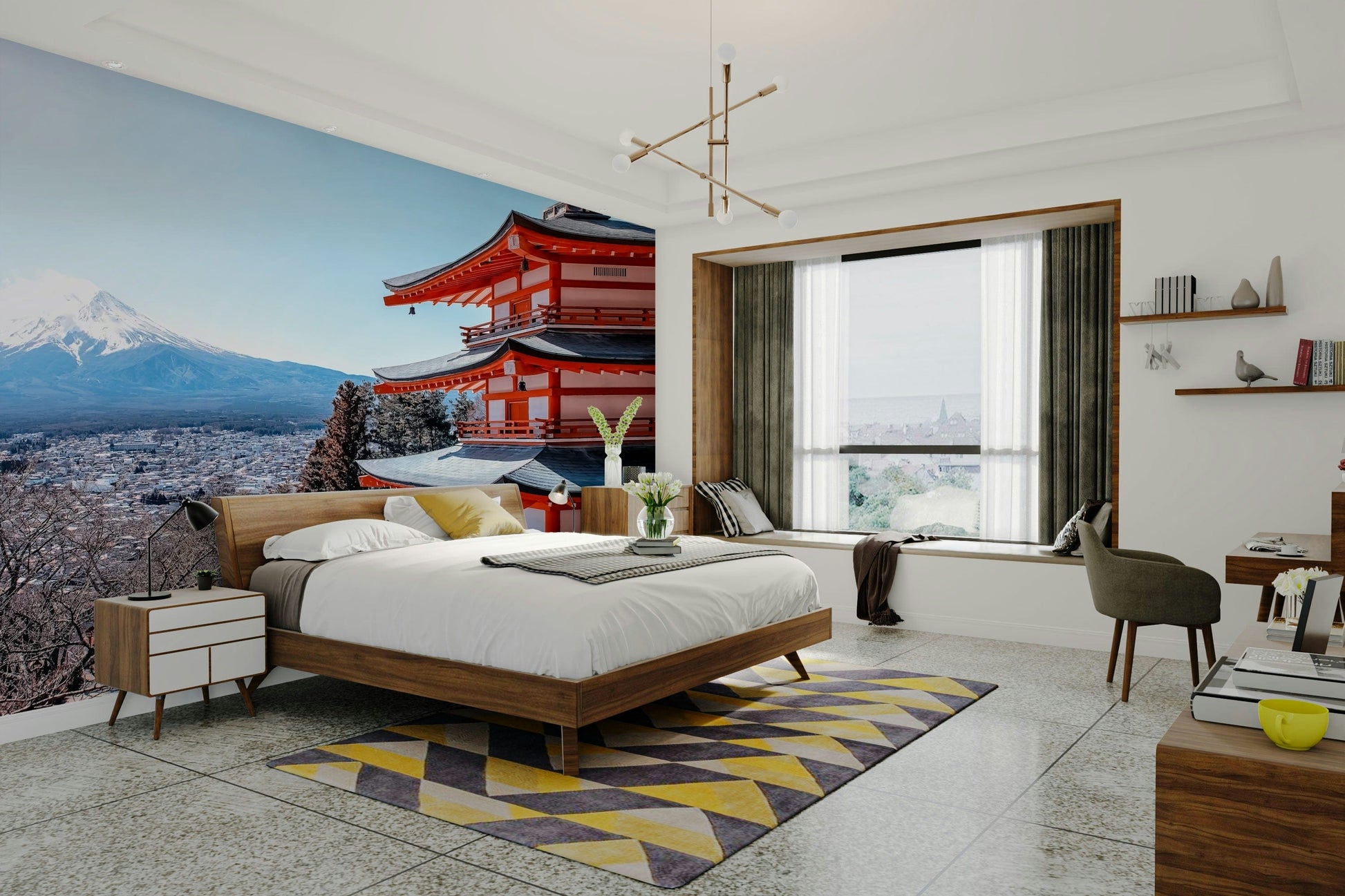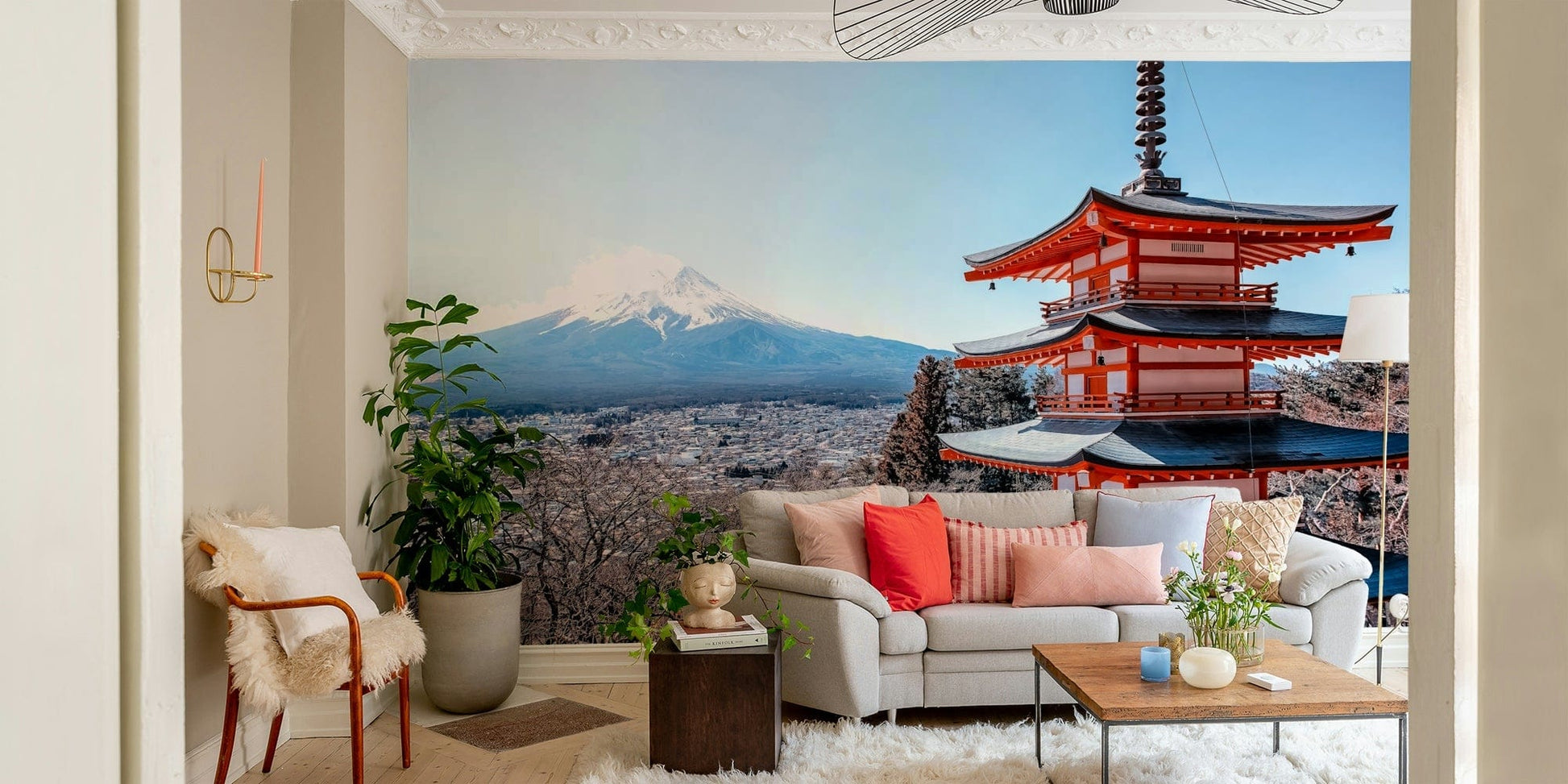 Transform your space with this tranquil landscape! It showcases the majestic Mount Fuji alongside a traditional pagoda. The clear blue sky and precise details draw attention. This wallpaper for walls brings peace to any space, from bedrooms to meditation rooms. Its balanced visual interest elevates minimalist or classic interiors. Enhance your room with this harmonious view.