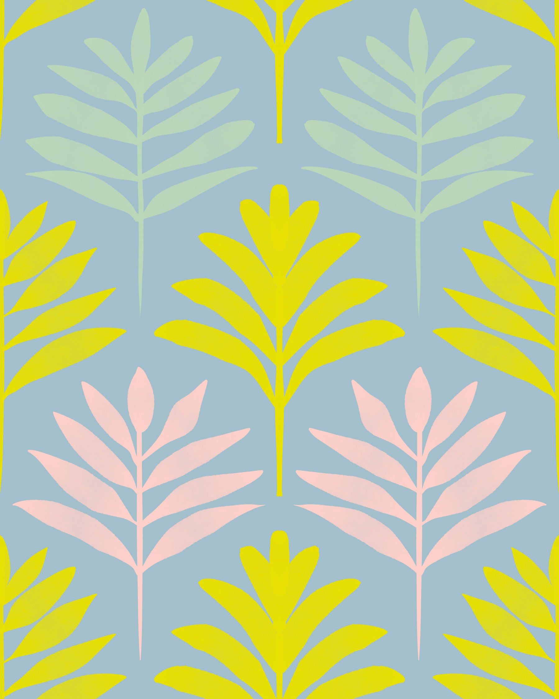 Escape to a tranquil tropical haven with this stunning wallpaper. The design features a repeating pattern of simplified, stylized palm leaves in a soft color palette. The calming blend of pale yellow, light green, and blush pink against a muted blue background creates a serene atmosphere perfect for relaxation. This minimalist yet expressive design is versatile enough for various spaces, including bedrooms, nurseries, living rooms, or even hallways, adding a touch of tropical elegance without being overwhelming. Its subtle texture and repeating motif create a harmonious and peaceful ambiance.