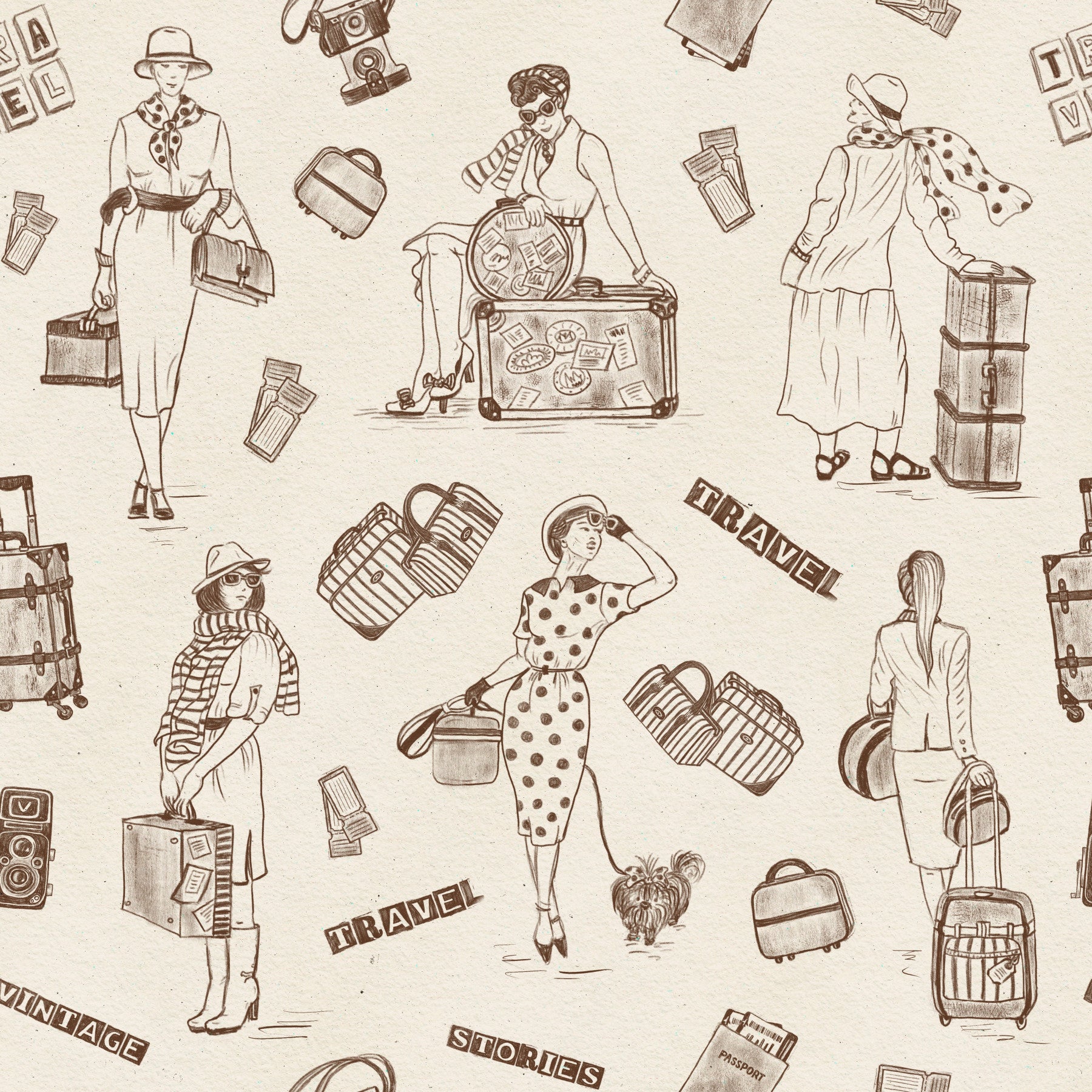 Capture the spirit of adventure with this travel-inspired wallpaper for walls. The repeated pattern of stylish travellers, vintage suitcases, and travel tickets creates a captivating scene. The monochromatic colour scheme complements a variety of interior styles, from modern to classic. The design is perfect for a home office, entryway, or even a chic powder room. Bring an element of sophistication with this travel illustration. The wallpaper coordinates well with travel-themed decor and wooden accents.