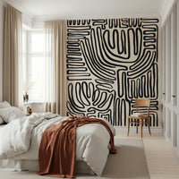 Invite an element of raw, artistic expression into your home with this tribal-inspired wallpaper for walls. Bold, black lines weave across a creamy background, forming evocative, abstract shapes reminiscent of ancient art. This design works well in a dining room, lending a grounding, yet refined aesthetic. Its minimalist colour scheme allows it to integrate seamlessly with existing furnishings. Install it in a bedroom for a serene atmosphere, where the rhythmic patterns foster a sense of calm. It offers an engaging visual texture, serving to enrich and modernise a variety of interior spaces.