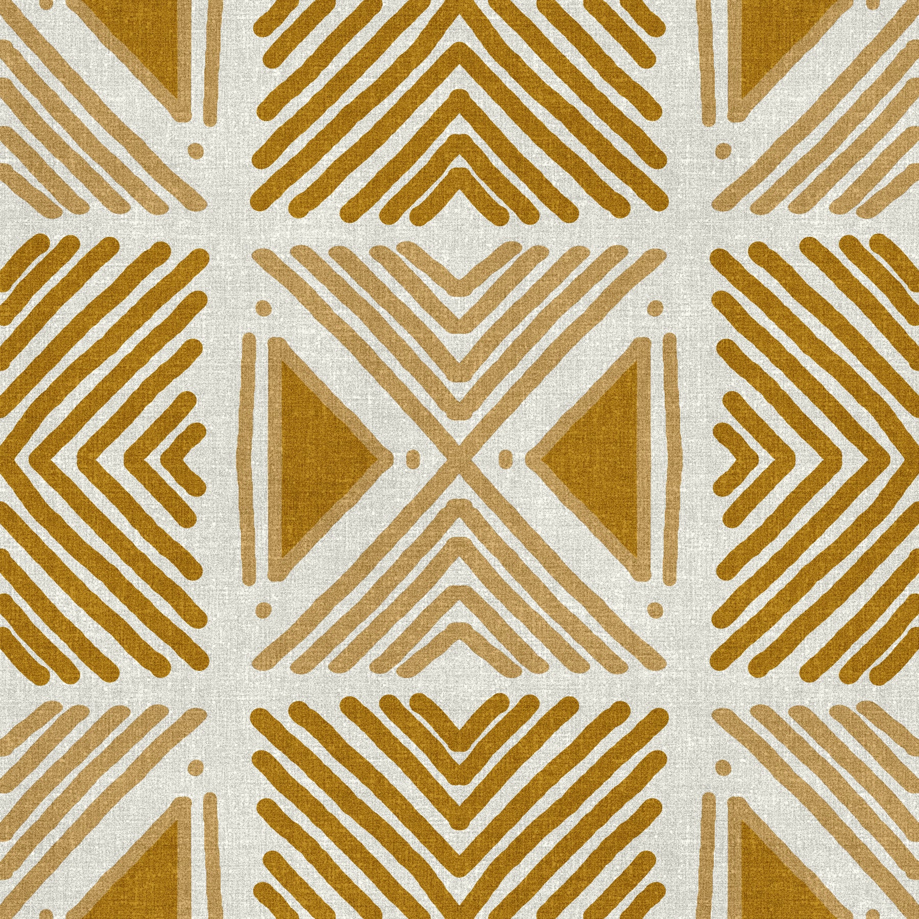 Rustic geometric wallpaper, ochre mustard tones, captivating motif.
