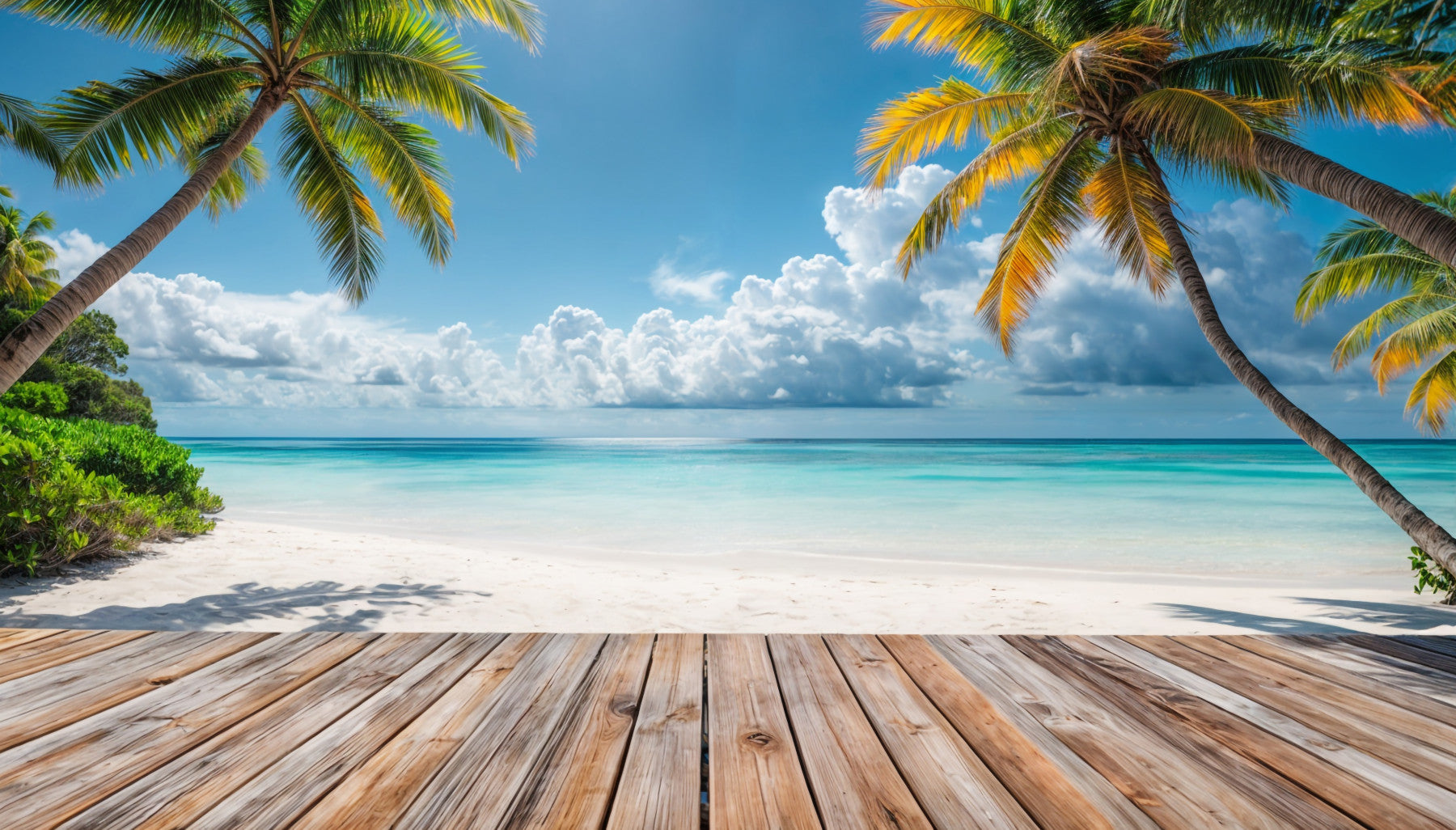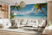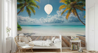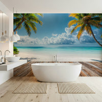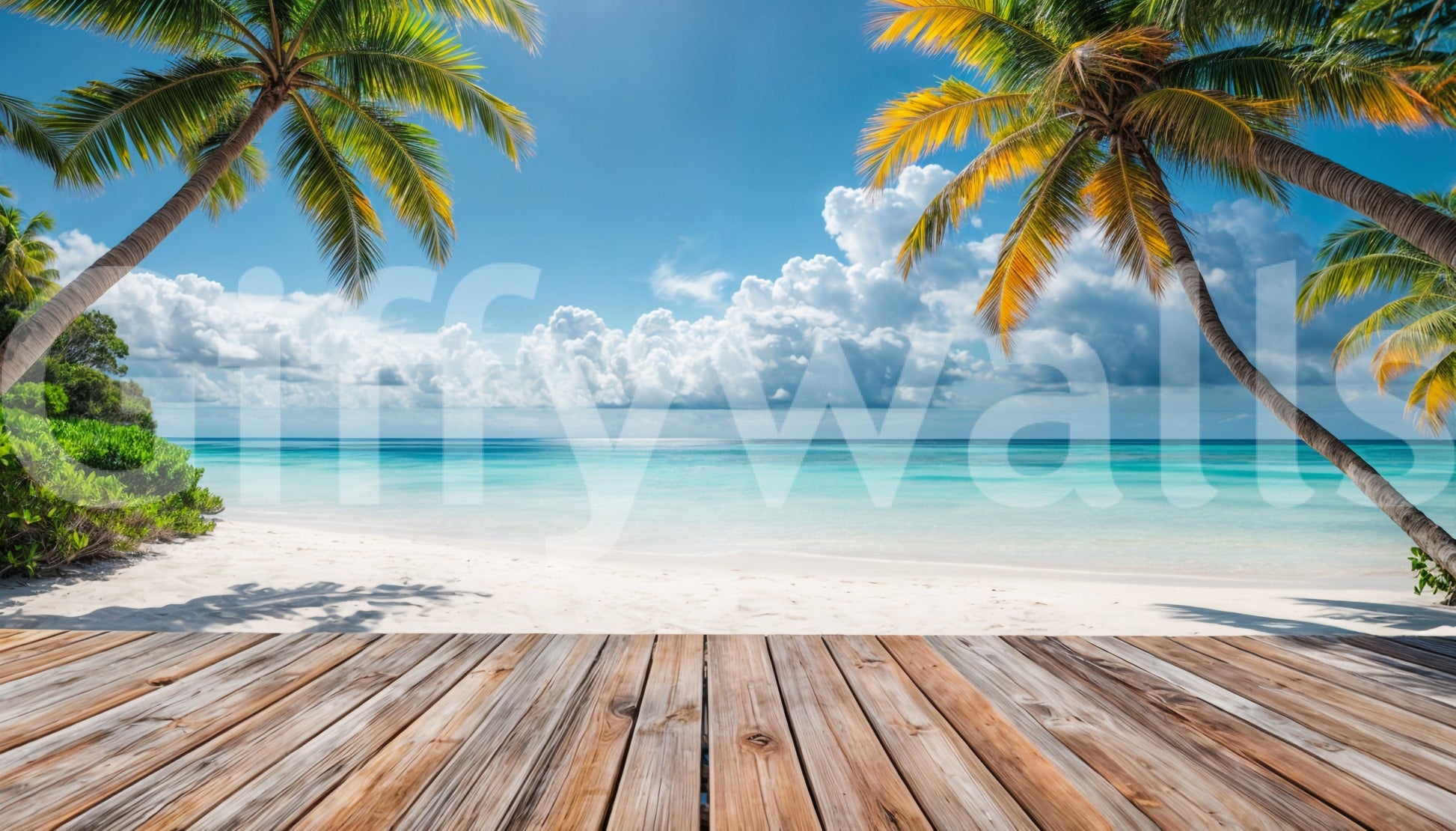 Bring the serenity of a tropical escape into your home with this stunning wallpaper for walls. The vibrant turquoise sea meets a pristine white sand beach, framed by lush palm trees against a clear blue sky. Sunlight dances across a wooden boardwalk, adding warmth and depth. The colour palette evokes a sense of peace and relaxation. It creates a refreshing atmosphere for a living room, bedroom, or bathroom. This design transforms any interior into a personal paradise, blending natural beauty with a touch of rustic charm and brightens up your space.