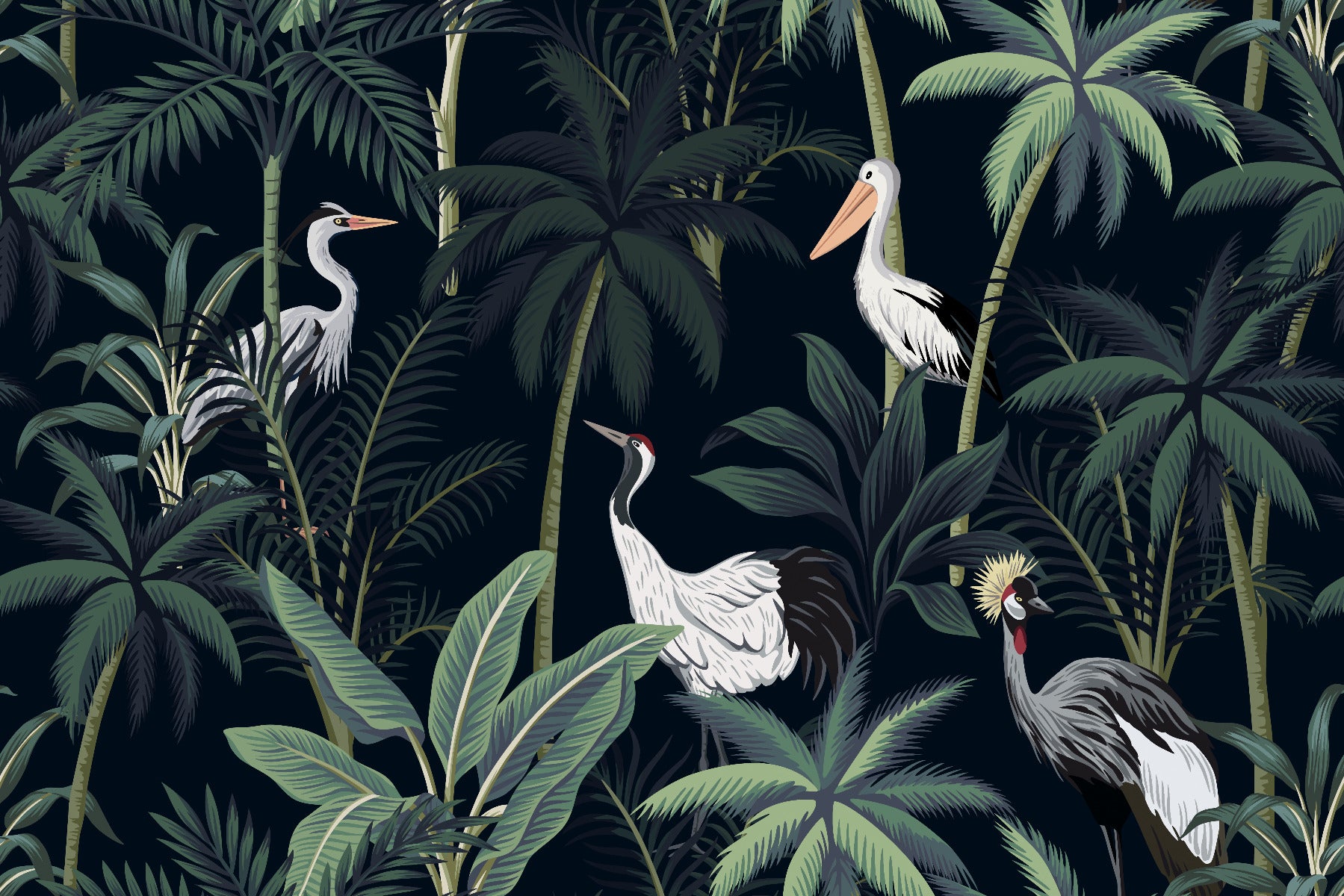 Update your space into an enchanting tropical haven with the peel & stick tropical crane birds in night sky wallpaper mural. As dusk falls on your walls, the silhouettes of majestic birds - from the poised pelican to the elegant heron - emerge amongst lush, verdant trees under a serene night sky. This night sky wallpaper for walls, with its easy application, invites a touch of nature's mystery into your bedroom, enhancing relaxation and guiding you into peaceful slumber. The sophisticated palette complements urban modern furnishings, creating a captivating backdrop for any room. Elevate your home with this unique dark tropical wallpaper mural and let the tranquility of the tropics envelop your living space.