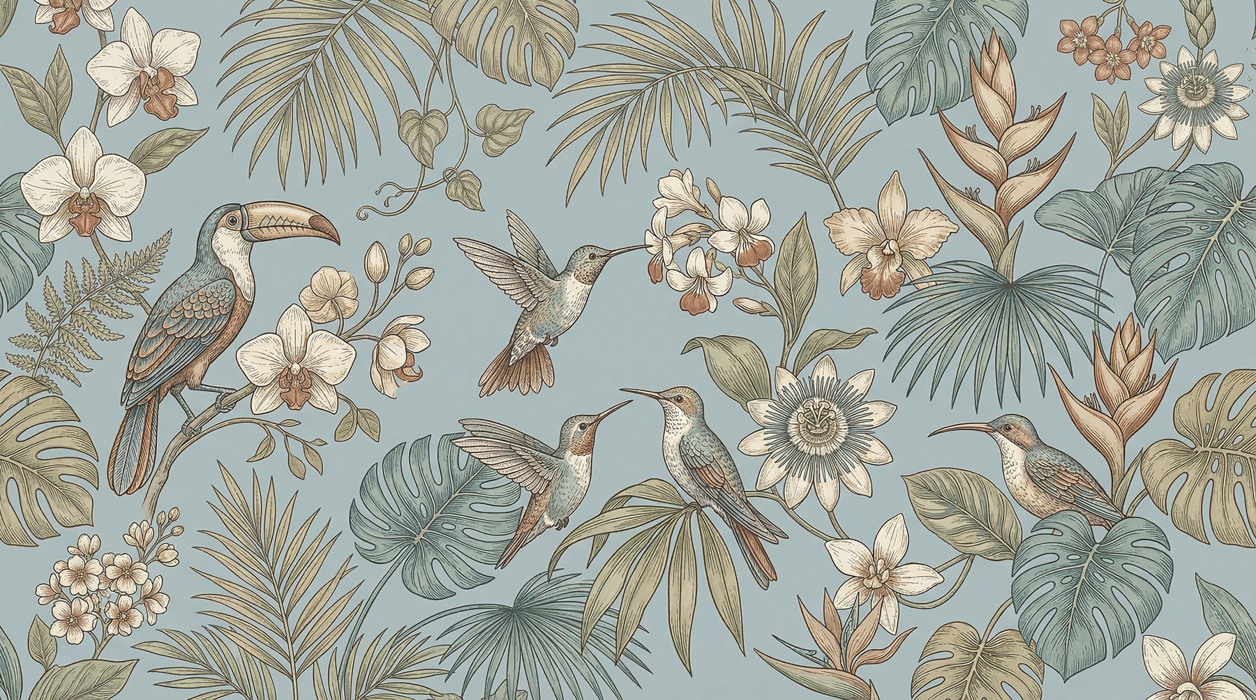 Transform your living space with this captivating wallpaper, a serene journey into an exotic botanical world. Meticulously illustrated tropical birds, including agile hummingbirds and a majestic toucan, nestle among a vibrant array of orchids, heliconia, and passionflowers. Lush palm fronds, Monstera leaves, and delicate ferns create a dense, inviting backdrop. The refined vintage illustration style uses a harmonious palette of muted blue-green, soft cream, warm olive, and subtle terracotta accents, evoking a timeless elegance. This design enhances bedrooms, dining rooms, or home offices, fostering a peaceful and sophisticated ambience. It also brings a refreshing, natural charm to bathrooms and sunrooms, completing interior spaces with an air of tranquil luxury.