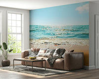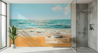 Transform your space into a tranquil haven with this gorgeous beach scene. The design showcases clear turquoise waters, golden sand, and vibrant green palm leaves. This wallpaper for walls evokes the essence of a relaxing tropical vacation. It is a stunning addition to bedrooms, living rooms, or even hallways. The design's soothing colours create a calming effect, while the natural elements introduce a touch of the outdoors. Use it to create a relaxing retreat in your home that radiates peacefulness and simple elegance.