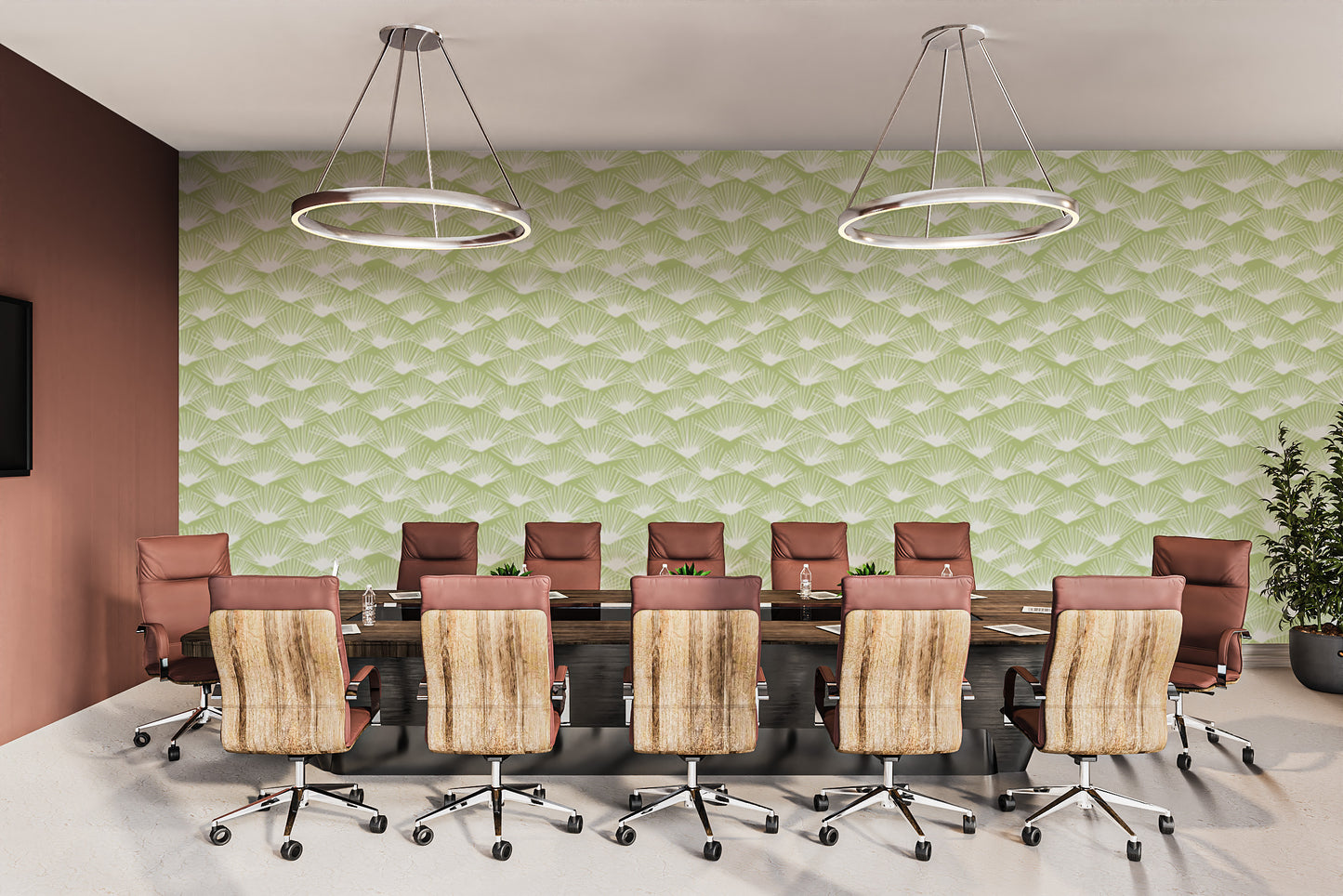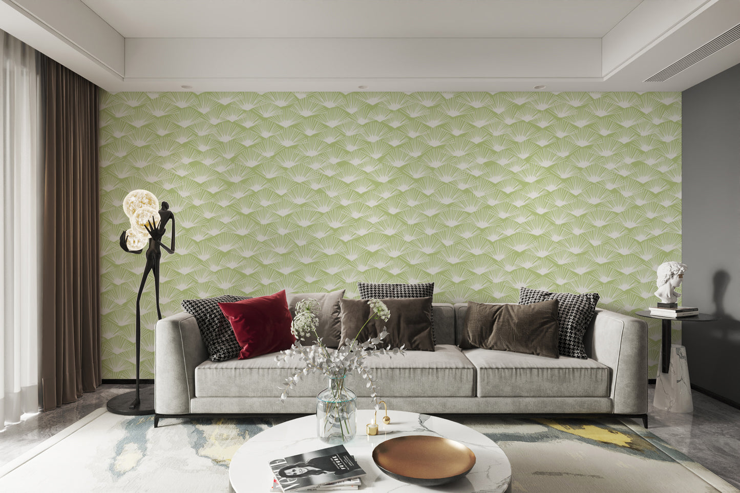 Embrace a lush, leafy vibe in your lounge area with the Tropical Fanfare Sage Wallpaper. A symphony of soft greens and delicate fan patterns offers a serene escape, perfect for crafting a serene retreat in your living room. The repeating geometric fans unfold across the wall, creating a sense of movement and rhythm that captivates and soothes. This wallpaper makes for a stylish statement, inviting nature's calming palette and organic shapes into your home, making it the ideal choice for anyone looking to refresh their living room wallpaper with a touch of botanical charm.