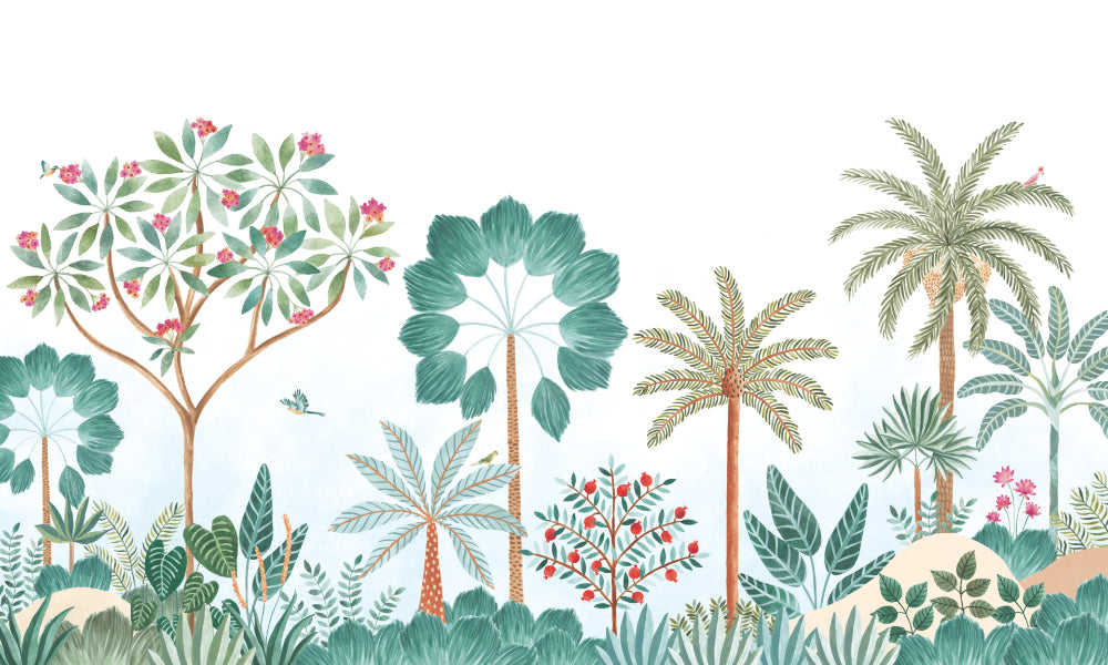 Invite a burst of nature's charm into any childs room with this tropical flora and fauna wall mural, perfect as nursery wallpaper. This whimsical panorama teems with lush greenery and exotic plants, making every glance an adventure. Delicate blooms and fronds dance across the scene, where hidden birds add a playful touch of wildlife. Imagine this scene sparking imagination and curiosity in young minds, while providing a serene backdrop for bedtime stories and play. The artistic detail of each leaf and petal promises to capture the eyes and hearts of both the young and the young at heart. This mural is a celebration of nature's endless creativity, ready to festoon a nursery with vibrant life.